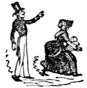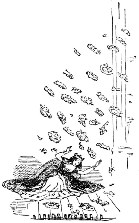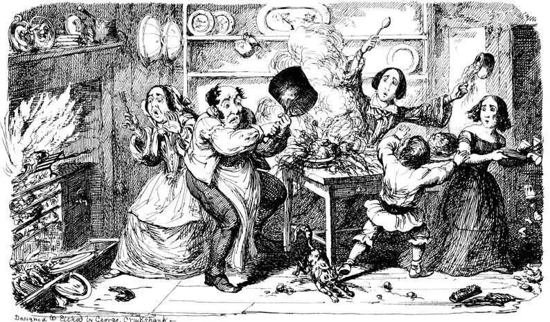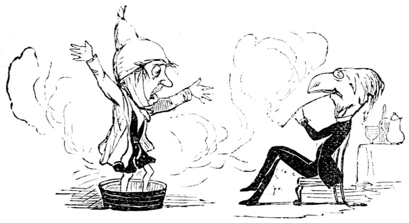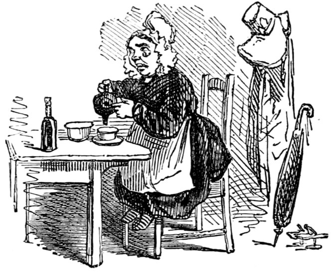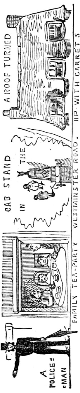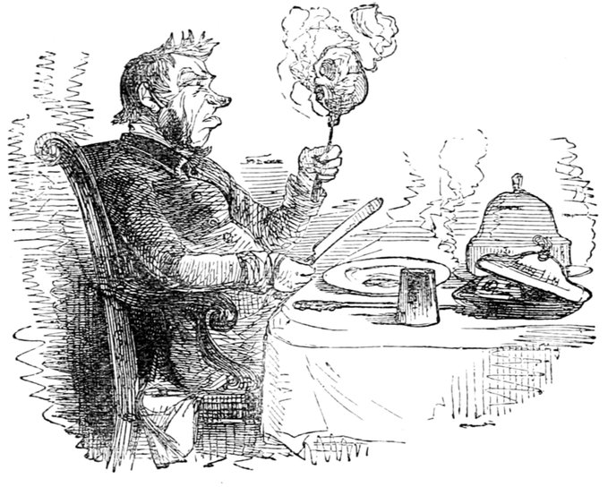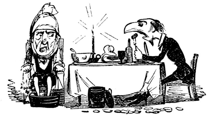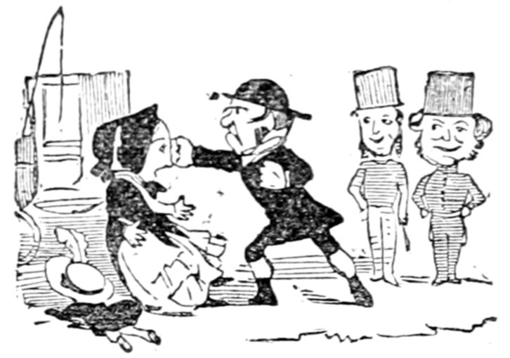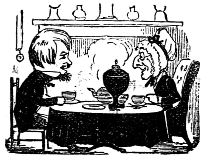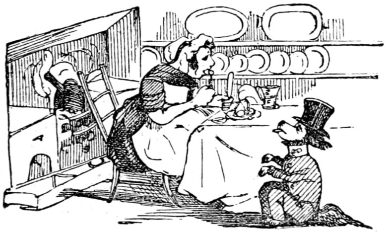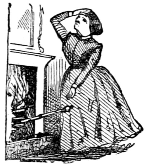 Mrs. Piper (superintending the chops and neglecting her punctuation)—"Oh dear, dear, dear! it's enough to drive anybody crazy with all the trouble I've had with the huzzies the nasty good-for-nothing, idle, lazy—the wicked presumptuous bad creatures, to think of their taking such a start. Don't talk to me, Piper; it's the fault of you men for taking their part. Can't blame them indeed for wanting to better their situations!—of course my servants were very ill used I understand your insinuations. No doubt it's a treat to you to see your poor wife made into a slave—not that there's any novelty in that I wish I was in my grave!—melted to death and getting into such a mess with the chances I have of even getting a new dress—at those dratted chops for you to guzzle. If you had the feelings of a man, you'd do something to help me. Oh! I daresay you're doing all you can—a pretty kettle of fish you're making of the Irish stew. Ah! there goes the poker on to the plates—don't tell me—you do it on purpose—you do. I didn't say you touched the poker but you do all you can to flurry me in one way or other—Tom, you naughty, unfeeling boy, how dare you join in the conspiracy against your poor mother? If your father's burnt you, it's just like him go and rub your hand with soap—though you'll be clever to find it—Yes—Mr. Piper, you're satisfied now, I hope—with your institutions and lectures and South Australia panoramas I wish Mr. Prout and all the rest of the wretches at the Polytechnic were pounded to death with sledge-hammers—putting notions of emigration into the heads of a set of brazen faces—but they've been a great deal too well treated, or they would not have had time to go to such places; and those newspapers talking about their rights and freedom if they'd minded their work they wouldn't have had time to read 'em. In my poor dear mother's time, no servant could get a place who knew how to read. Ought to be treated like human beings? a pretty story, indeed! I know what you mean Piper you needn't try to keep your gravity—but they were always thinking of husbands and settling in life or some such depravity.