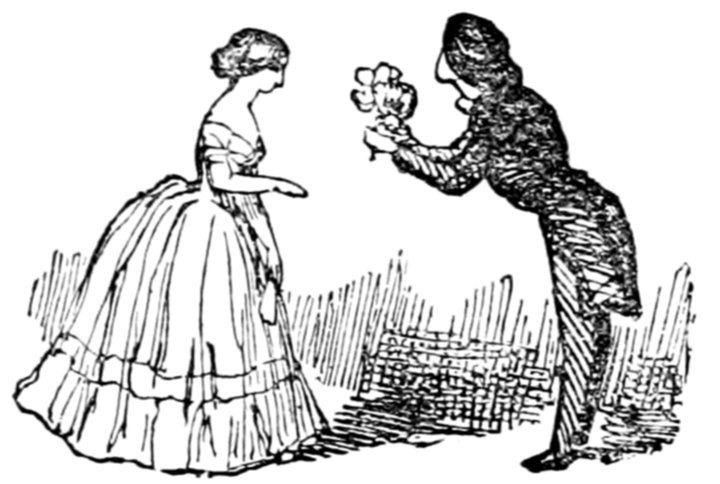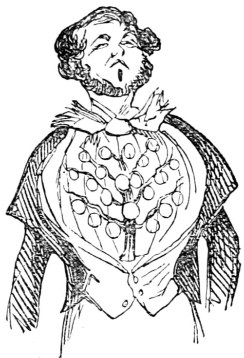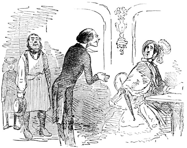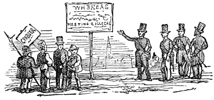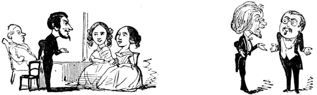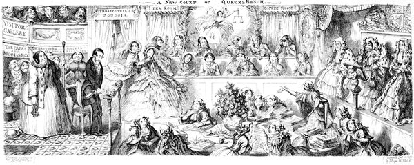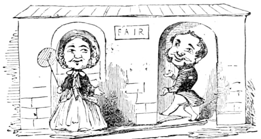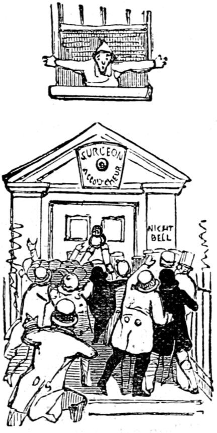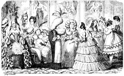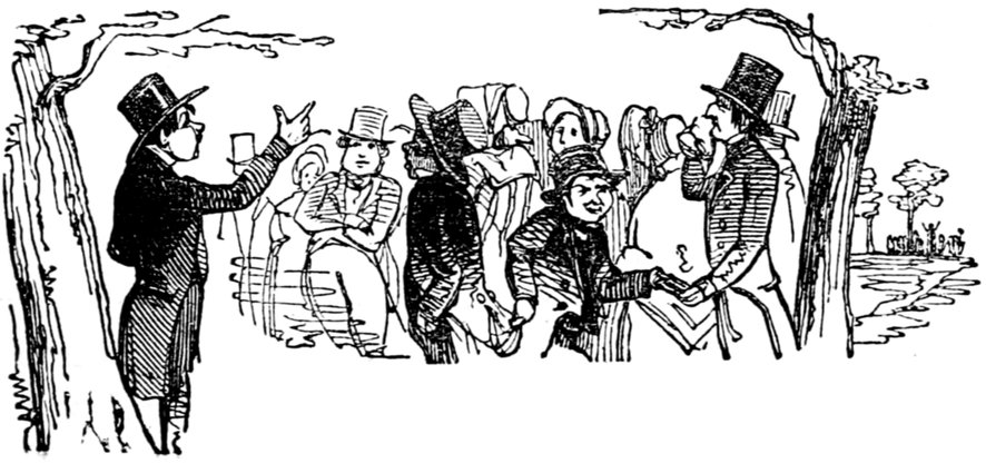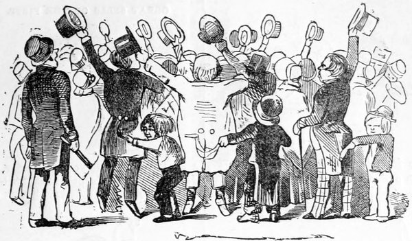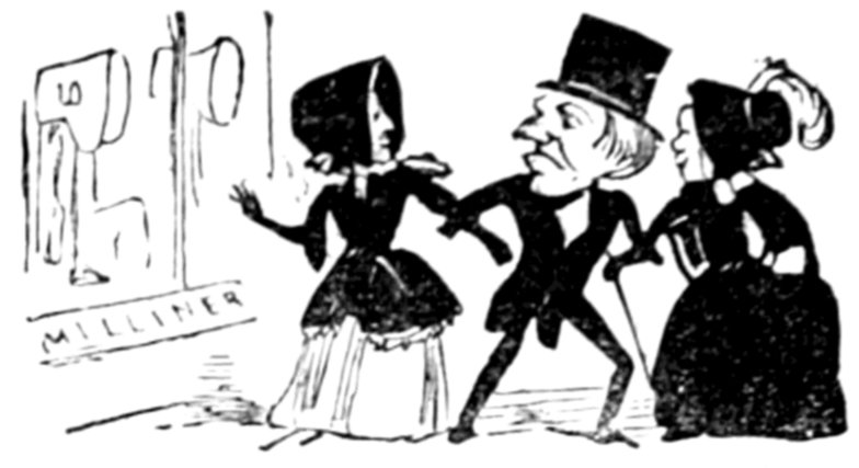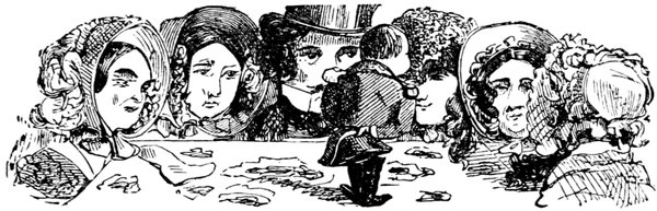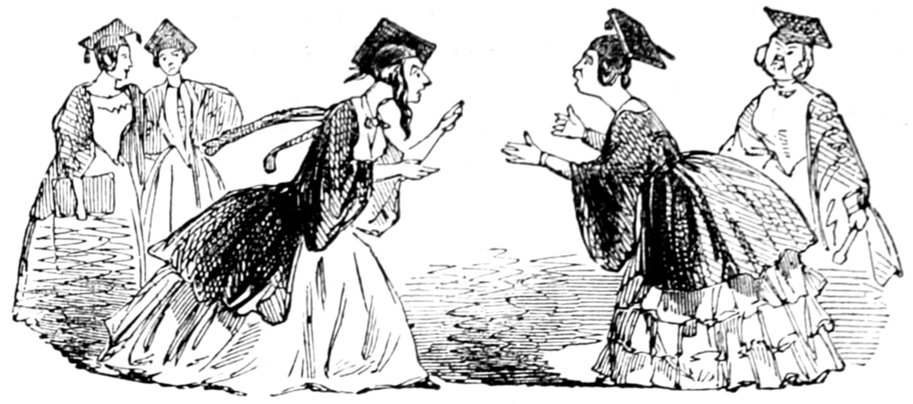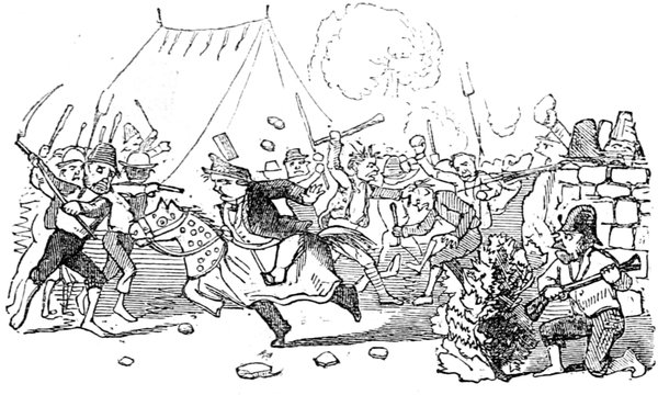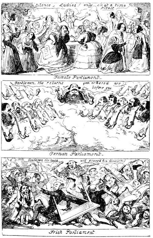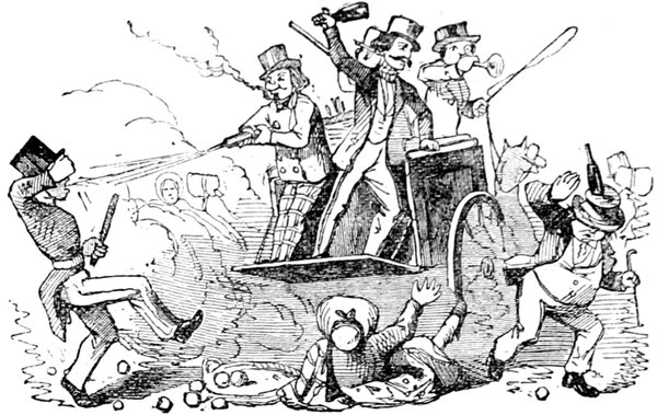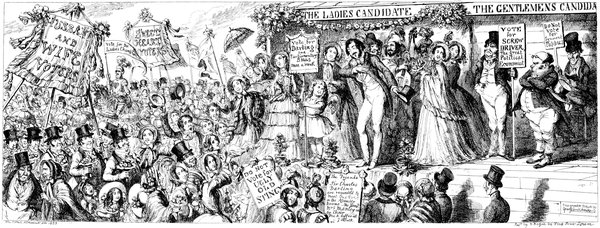 Ladies, then, angels, goddesses ("Oh!" from an elderly bachelor, who was removed by the police), for the thrilling position in which I am placed, how can I be sufficiently grateful to that glorious reform in our electoral system, which has partially recognised the true position of lovely woman? ("Partially!" in a tone of sarcasm, from a member of Mr. Screwdriver's committee). My honourable and gallant friend objects to the adverb. I say partially, for by admitting the ladies to the Franchise with the gentlemen, they are but recognised as equals, instead of superiors. (Great sensation.) Yes, ladies, and it shall be my earnest endeavours as your representative ("Yah!" and "Not yet!" from Mr. Screwdriver). My honourable and gallant friend observes "Not yet." It is true I have a formidable rival to contend with. The charms of his person, (screams, and "the Old Fright!") his known politeness, above all his taste in dress (here the laughter and clapping of kid gloves rendered the speaker inaudible for some moments)—compared with such claims, mine are worthless ("Do listen!" and "The Duck!"), extending no farther than a willingness, I may say a downright anxiety, to die in the cause of the fair creatures, who, I believe I may say, have done me the honour to elect me as their champion ("Yes! Yes!") With the ladies' voices in my favour, I believe I need not fear those of the gentlemen being exerted against me. (Cries of "We should like to see them," "Speak up, Alfred, do," "I'm ashamed of you," &c.) I thank you, gentlemen—or rather I do not thank you; I honour you for your—may I say obedience? ("Oh yes!" in a rapturous tone, from the engaged gentlemen), though, after all, I don't see how you were to help yourselves. (Great applause, and numerous bouquets thrown.)