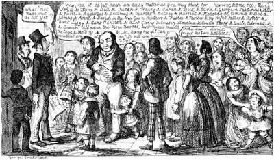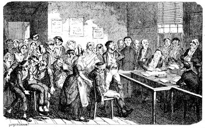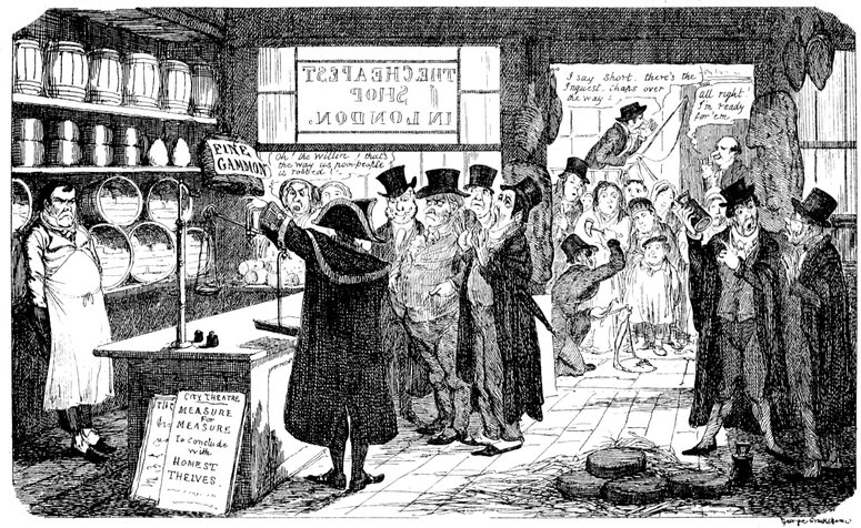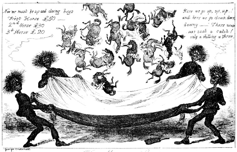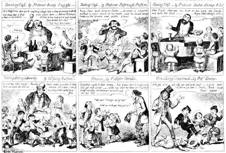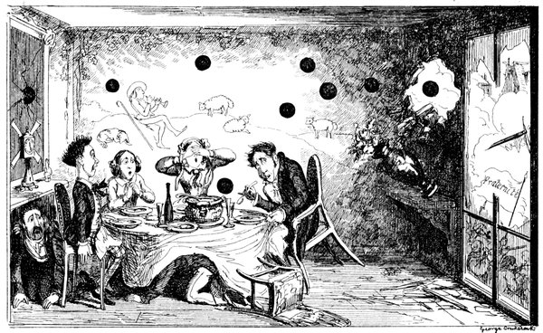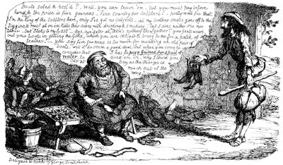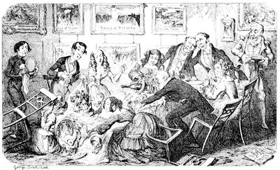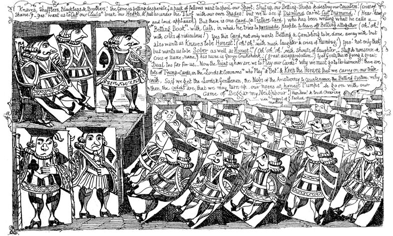 A Pack of Knaves, or A "Packed" meeting of the "Knowing Cards" of the Betting-Shop interest to consider & adopt the best Shuffling Tricks to carry on their Game! A humble attempt in the "Pre Raphael" Style by George Cruikshank.
