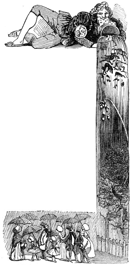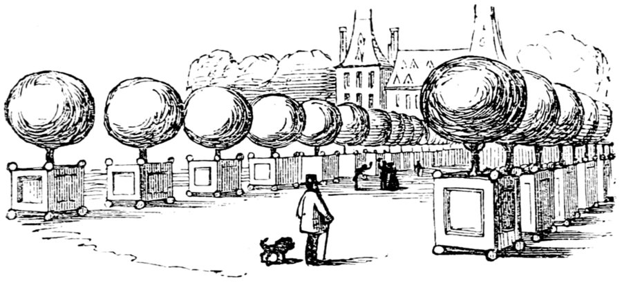 I should like to know why the French can't allow their trees to grow as they like, instead of cropping and clipping them, like so many whiskers on the face of Nature. These singular-looking ter-restrial 419spheres, planted in square tubs, in the Luxembourg Gardens, I am told are orange-trees. Very good. Their resemblance to oranges is certainly striking. I should be happy to accept their appropriate rotundity as a precedent for the invariable rule (as having an instructive tendency), but that, on inspection, I do not find the neighbouring groves to consist of pear-trees as, judging from appearances, I was induced to imagine.
