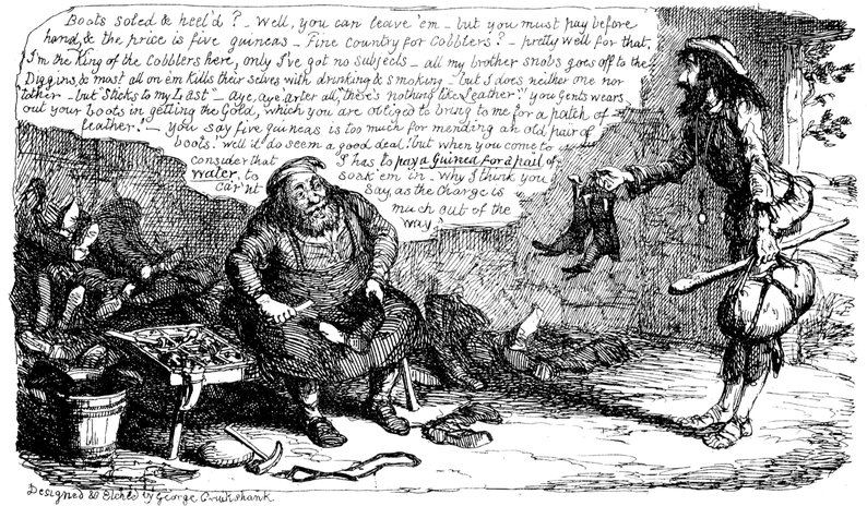 A friend of ours (had we been writing in the last century, we should have said a wag), was expressing himself in terms of the highest indignation with, or rather without, respect to his shoe-maker for presuming to emigrate to Australia, on the pitiful plea that he (our friend) was the only customer he had left. We remarked that we could see nothing reprehensible in his conduct—especially as all his former patrons had deserted him. "What are his former patrons to me?" exclaimed our friend; "I am the only one remaining to him—and a cobbler ought to stick to his last."
