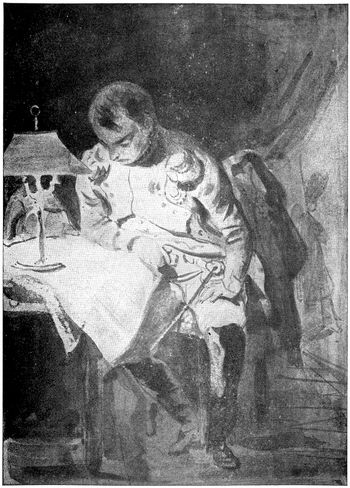 Arriving at his night quarters, the Emperor found his office ready—a tent or room with five tables, one in the center for himself, and one at each corner for his private secretaries. On his own was a map oriented, and dotted with colored pins which marked the position of each body of his troops. For this campaign he had the only one in existence, prepared long in advance, by his own orders. As soon as possible was arranged the Emperor's bed-chamber, across the door of which Rustan slept, and adjoining it was another for the officers on duty. Dinner occupied less than twenty minutes, for in the field Napoleon ate little, and that rapidly. By seven in the evening he was asleep. At one in the morning the commander-in-chief arose, entered his office, where the secretaries were already at work, found all reports from the divisions ready at his hand, and then, pacing the floor, dictated his despatches and the orders for the coming day. There is an accepted tradition that he often simultaneously composed and uttered in alternate sentences two different letters, so that two secretaries were busy at the same time in writing papers on different topics. The orders, when completed and revised, were handed to Berthier. By three in the morning they were on their way, and reached the separate corps fresh from headquarters just before (p. 427) the soldiers set out on their march. It was by such perfect machinery that accuracy in both command and obedience was assured.