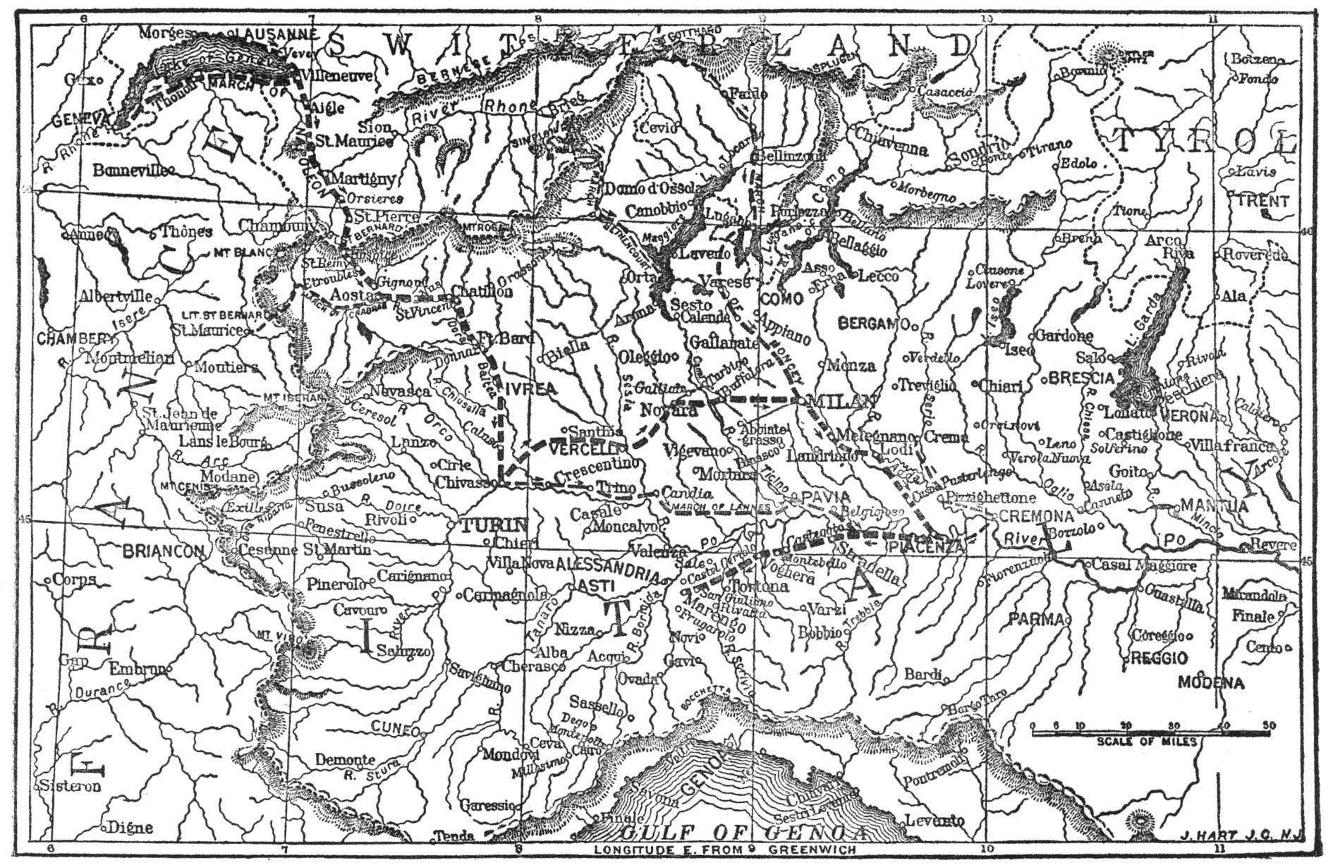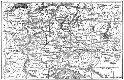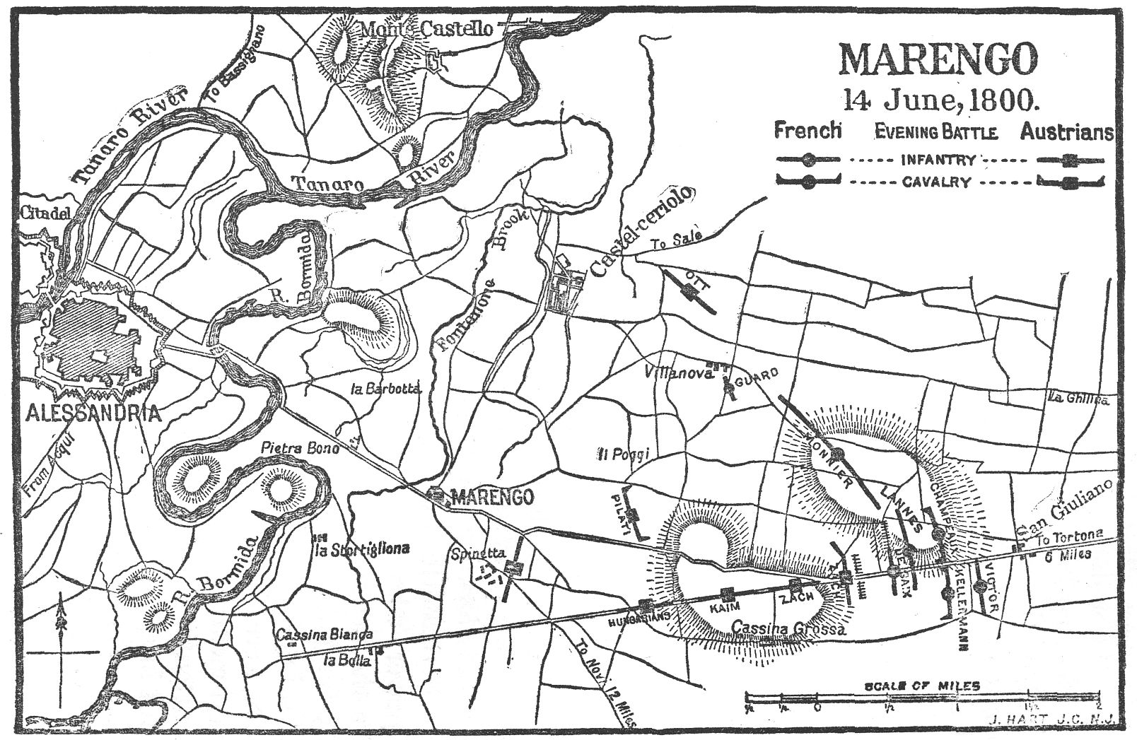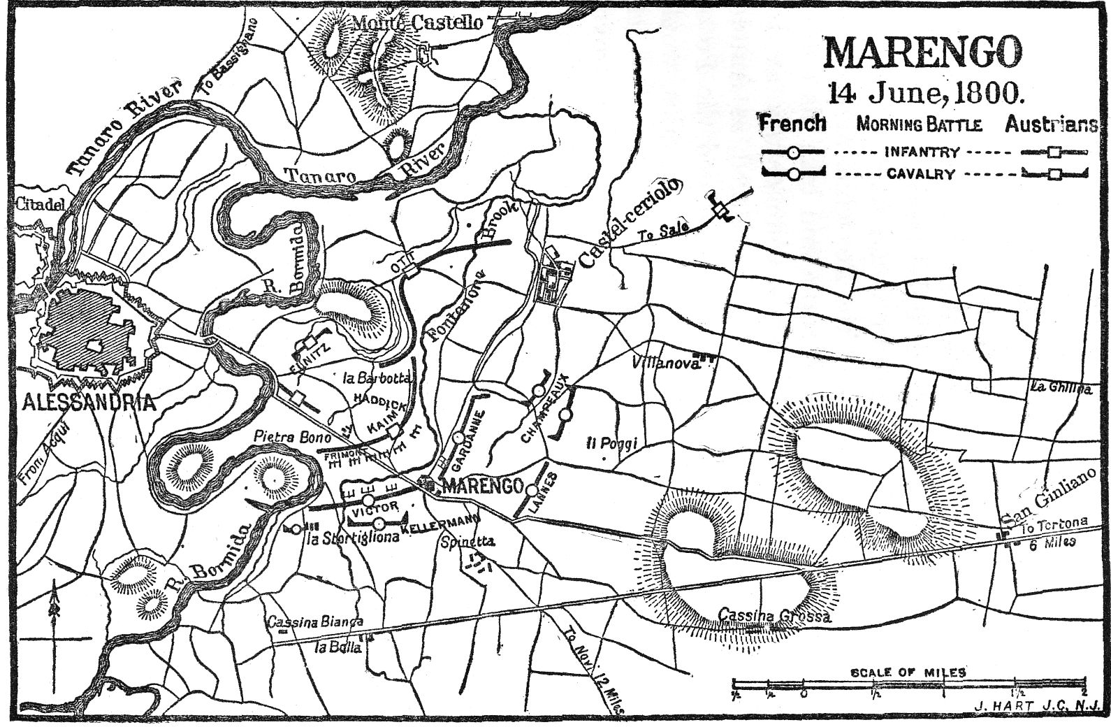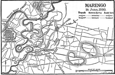 Footnote 16: The important military authorities are Napoleon's own letters and bulletins. Dumolin: Précis d'histoire militaire. Yorck von Wartenburg: Napoleon als Feldherr. Jomini: Histoire critique et militaire des guerres de la Révolution, 1792-1803. Dodge: Napoleon. Clausewitz: Werke. For other material see Thugut's letters, Marbot's memoirs, Thiébault's Journal of the Blockade of Genoa, Valmy: Histoire de la Campagne de 1800, Alison's Castlereagh, Woronzow's Archives, and Bailleu: Essays in the Historische Zeitschrift, vols. 77 and 81; Cugnac: Campagne de l'armée de reserve en 1800, La campagne de Marengo; Gachot: La deuxième campagne d'Italie; Neipperg: Aperçu sur la bataille de Marengo; Hüffer: Quellen zur Geschichte des Zeitalters der französischen Revolution; Picard: Bonaparte et Moreau.[Back to Main Text]