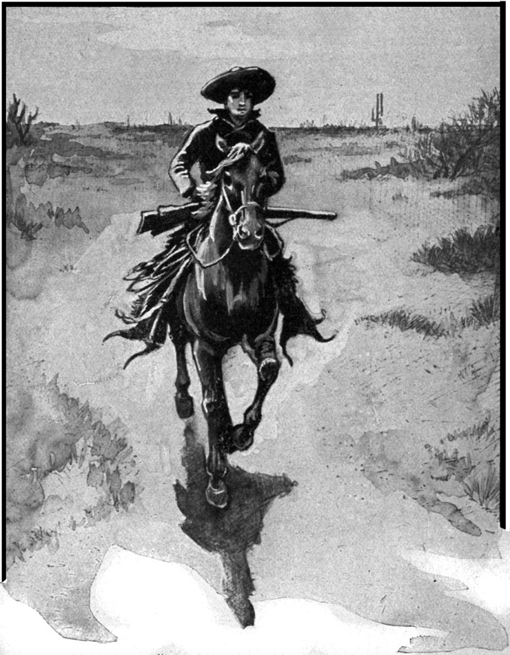In the saddle sat a boy about fourteen years of age, a gray-eyed, brown-haired young fellow, broad-shouldered and well made, whose sunburned face was all aglow with health and who seemed to feel altogether at home in the stirrups. He wore a palm-leaf sombrero, a blue flannel shirt and trousers, while the revolver case at his belt and the carbine slung at his back added to the dashing effect of his outfit.