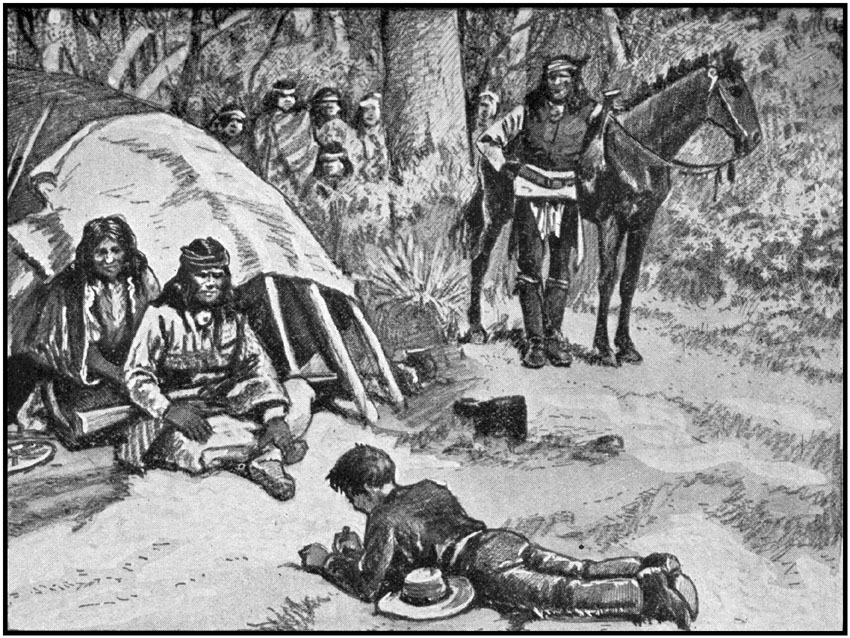 Hardly was he well concealed behind dense bushes before, as he peered out, he saw Wah-wah-o-be, followed closely by Crooked Nose, gallop into the deserted camp. She had already heard that Ping was wounded, but not how badly, and she threw herself upon the ground beside him with a great cry. Crooked Nose bent for one moment over Tan-tan-e-o-tan, and the Apache death-whoop rang twice, long and mournfully, through the forest. It was followed by fierce and angry utterances, among which Cal caught something about Mexicans, and then Crooked Nose looked sharply around him.