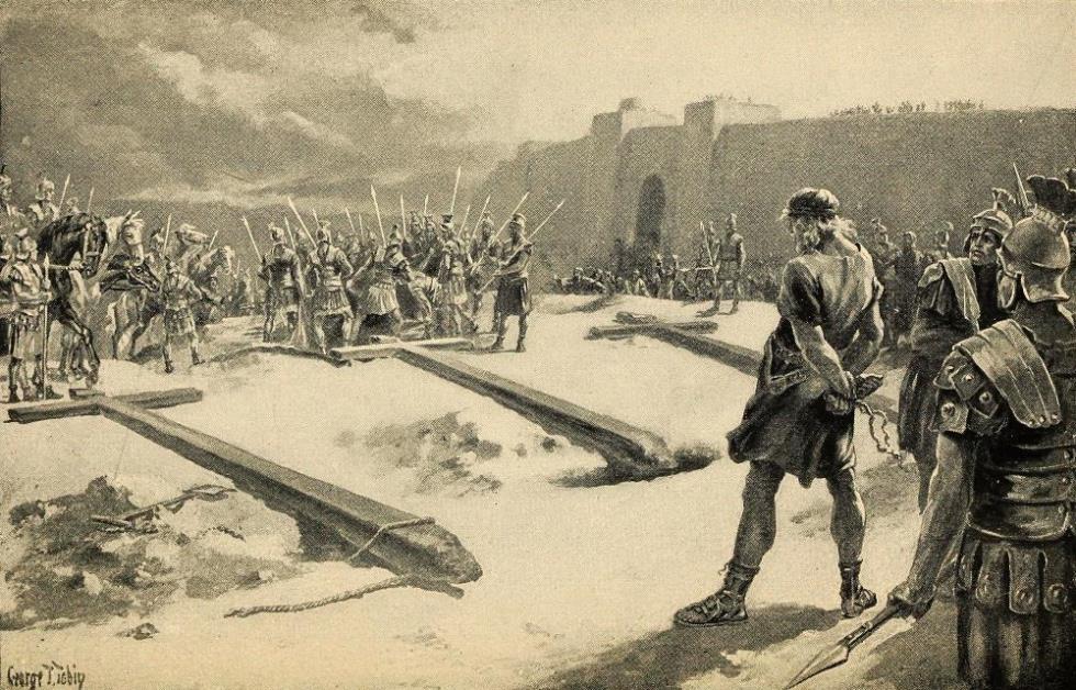 Near to him then were these soldiers, but he saw one of them thrust a pilum blade into the side of Jesus, making a wound from which poured both blood and water. Quickly, now, came merciful relief to the two others, for the soldiers made an end.