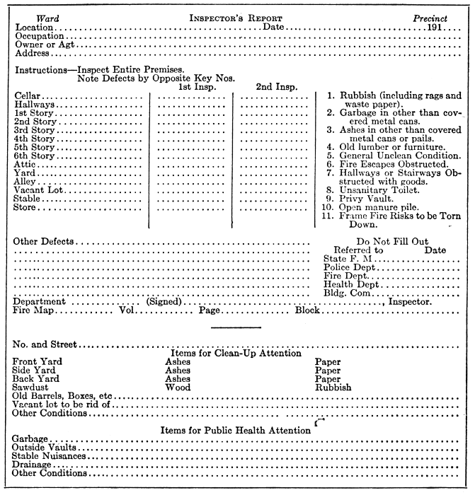 In many cities the Scouts have done splendid work in inspection duty, reporting all unsanitary conditions. In patrols, troops or companies they are assigned to investigate and report to the superintendent of streets or the organization having charge of the clean-up. The inspection is done day by day as the clean-up progresses, and any oversight or unsanitary condition reported at once.
