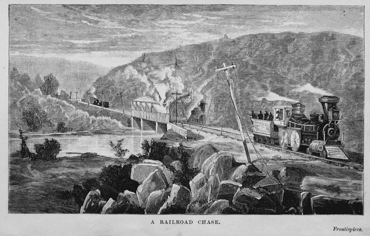 "Since our last issue we have obtained full particulars of the most thrilling railroad adventure that ever occurred on the American continent, as well as the mightiest and most important in its results, if successful, that has been conceived by the Lincoln government since the commencement of this war. Nothing on so grand a scale has been attempted, and nothing within the range of possibility could be conceived that would fall with such a tremendous, crushing force upon us as the accomplishment of the plans which were concocted and dependent upon the execution of the one whose history we now proceed to narrate.