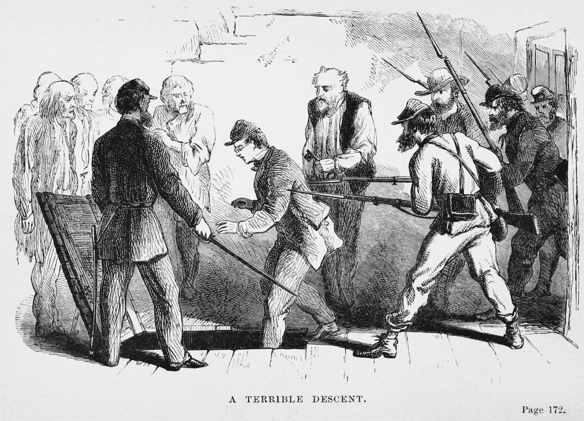 It would be easy to fill a volume with stories told us by the loyal citizens confined in this room. One or two may serve as specimens. I became very intimate with a Scotchman named Miller, from Texas. He told me of the beginning of the reign of terror, which prepared the way for secession. The rumor, in Miller's neighborhood, was first spread of an intended slave insurrection. Weapons, and in some cases poison, were secreted, to be afterwards found at the right time. Some slaves were next whipped until, under the torture, they would confess to the intended insurrection, and implicate the most prominent opponents of secession. This was enough to drive the populace to madness. The fear of servile insurrections has always aroused the worst passions of slaveholding countries. Slaves and white Unionists were now hung up to the same trees, and the work went on until all who opposed the withdrawal of the State from the old Union were treated as criminals. It is not strange that slavery thus furnished the means as well as the occasion of rebellion.
