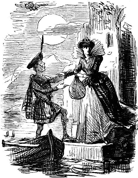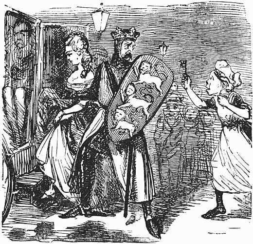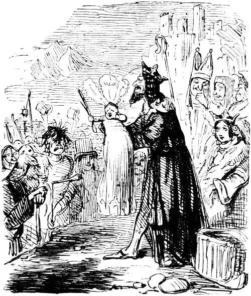 Later on in the history we have another good example of Leech’s humour. King Edward, having subdued the Welsh, “endeavoured to propitiate his newly acquired subjects by becoming a resident in the conquered country. His wife Eleanor gave birth to a son in the castle of Caernarvon, and he 261 availed himself of the circumstance to introduce the infant as a native production, giving him the title of Prince of Wales, which has ever since been held by the eldest son of the British sovereign.”