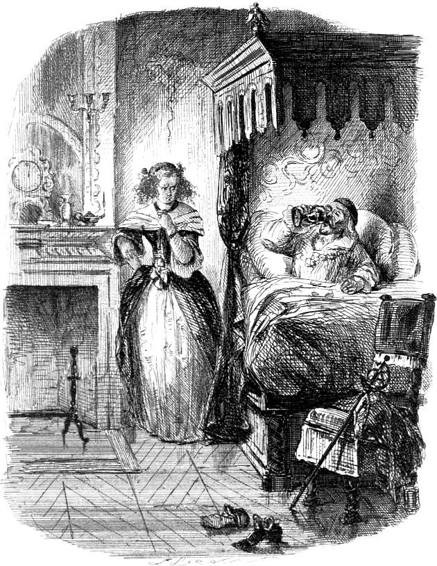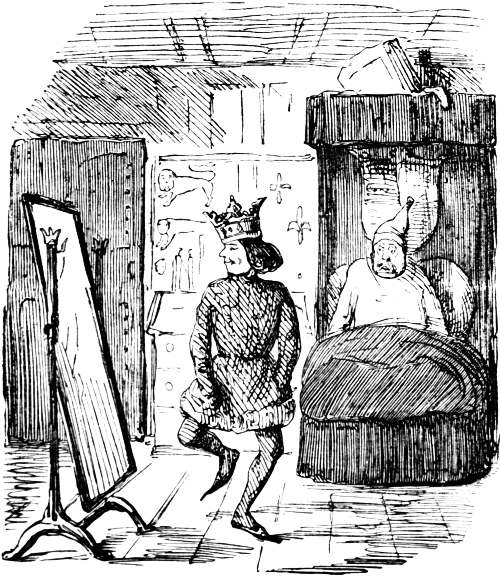 A well-known historical scene is parodied as follows: Henry IV. being ill, “the Prince of Wales was sitting up with him in the temporary capacity of 262 nurse,” says Mr. Ã Becket. “The son, however, seemed rather to be waiting for his father’s death than hoping for the prolongation of his life; and the King having gone off in a fit, the Prince, instead of calling for assistance or giving any aid himself, 263 heartlessly took that opportunity to see how he should look in the crown, which always hung on a peg in the royal bedchamber. Young Henry was figuring away before a cheval glass with the regal bauble on his head, and was exclaiming, ‘Just the thing, upon my honour!’ when the elder Henry, 264 happening to recover, sat up in bed and saw the conduct of his offspring.