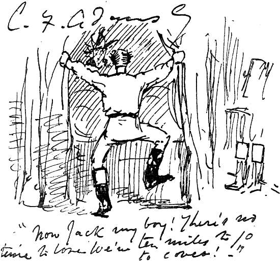 Here follows an admirable sketch of Mr. Adams waking up Leech with, “Now, Jack, my boy! There’s no time to lose; we’ve ten miles to go to cover.”