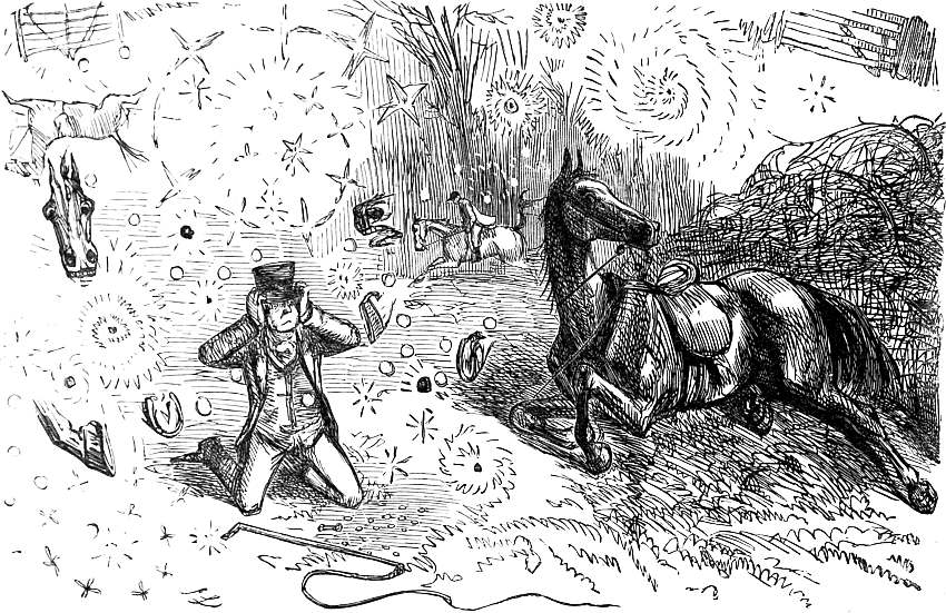 There is amongst the pictures of “Life and Character” a drawing of a sportsman who has been thrown from his horse. He has fallen upon his head, and as he raises it, stunned and bewildered, and but half conscious, the sensations that must have possessed him are realized for us in a manner so marvellous, so wonderful in its originality and truth, as to convince one that the accident must have happened to the man who drew the picture; and this was the case, for the fallen man was Leech himself, says Mr. Adams, who in charging a fence was thrown, his horse falling at the same time. If I had been told that the sensations inevitable under the circumstances were required to be reproduced by pencil and paper, I should have said such a feat was beyond the reach of art; but there they are! As the prostrate man looks up, he sees sparks of fire, horse’s head, legs, hoofs mingled together in a whirl of confusion round his prostrate figure.