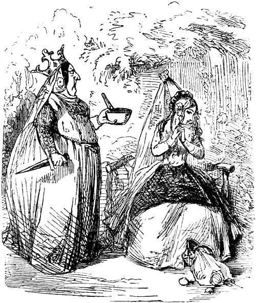 “The Queen, hearing of the silk, resolved naturally enough to unravel it. She accordingly started for Woodstock one afternoon, and, suspecting something wrong, took a large bowl of poison in one hand and a stout dagger in the other. Having found Fair Rosamond, she held the poniard to the heart and the bowl to the lips of that unfortunate young person, who, it is said, preferred the black draught to the steel medicine.”