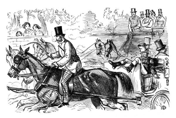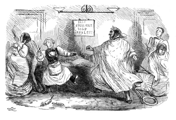 It is said that this engraving sent down the circulation of Punch to an alarming point. I confess my inability to understand this, and would rather attribute the decadence to some other cause, contemporary with the production of "Foreign Affairs." The drawing is somewhat hard upon the foreign frequenters of the purlieus of Leicester Square, and would only have been more acceptable to John Bull on that account. By Leech's non-appearance in Punch for many months after "Foreign Affairs" was published, one is driven to the conclusion that the managers had little faith in him as an attraction. The second volume contains very few of Leech's designs, while it bristles with inferior work.