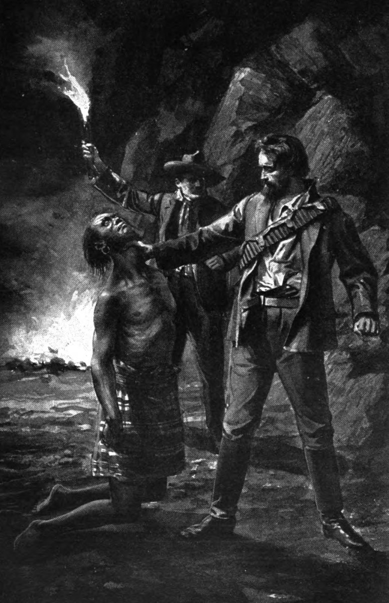 I snatched a piece of smouldering pineheart, fanned it to a blaze, and, hastening to where they stood, held it up. The thing that I saw was as grim as it was weird. Kahikatea stood like a bronze statue, with one arm stretched out. In the hand of that arm was the throat of the wizard, whose body hung from it, limp and lifeless. Kahikatea’s face was set, his teeth clenched; the command, “You cannot let go!” was written on iron in every feature, muscle, and limb; and, with his eyes fixed on the lifeless thing he held suspended by the throat before him, he was still strangling that wizard, whose last twisted hideousness was too frightful to describe.