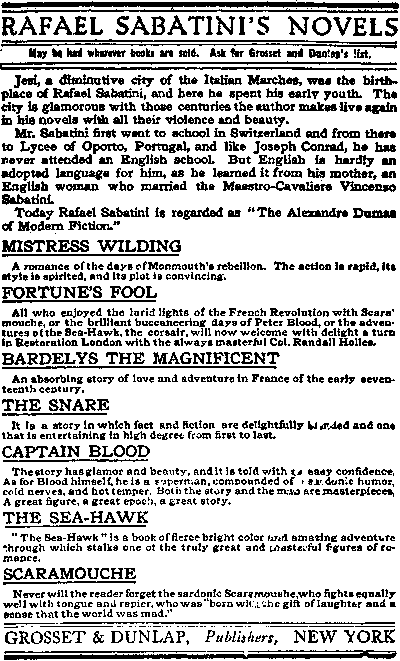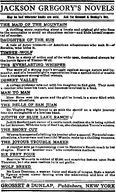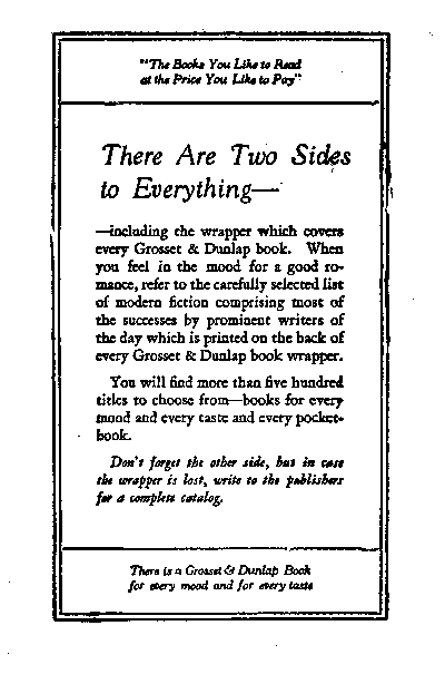 The only one who knew lay sleeping on the veranda and couldn't tell. It isn't likely that he dreamed, but if he did it might have been of being tied to the handle of a trunk in an overland limited baggage car; of the train's stopping for water at a lonely tank; of the earthy, wholesome country smell that came through the door, left open for coolness.