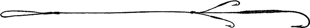 The loops are pulled tight, and then the fly and the line are drawn in opposite directions, the result being that the knots formed by the[19] loops meet and make a firm, and at the same time an almost imperceptible, joining. You then clip off any ends that may remain. So much for the tail fly. The putting on of the other two is simplicity itself. You take the strand of gut on which the next fly you purpose affixing is dressed, and laying it along the main line, taking care to have the hook lying in the reverse direction from the tail fly, you tie it into the line a yard from the fly already attached. In tying it in, leave the hook hanging about two and a half inches from the line. The third, or "bob" fly, is attached in like manner, and thus your cast of flies is completed. The only objection to this method of making up a cast is, that once the middle and bob flies are tied in, they cannot be used again. This is quite true; but the keen angler will submit to the little extra expense on this score for the gratification which the sight of a really neat cast will afford him. The system of suspending hooks by loops, especially when using fine tackle, is almost entirely exploded. We should have said that previous to use, all gut should be soaked, and the longer the better. It is a good plan to let it soak over night, and[20] make up your cast in the morning. When gut is thus thoroughly wet, it is wonderful how easy it is of manipulation. On the other hand, dry gut is very brittle, and will break on the slightest provocation. Fix the cast and silk-and-hair line together, having previously made a single knot on the end of the latter, as illustrated below—