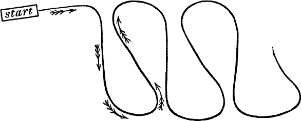 Our readers will have guessed, from what has preceded this chapter, that we don't believe in trolling if it can be avoided; but still there are times and occasions on which it must be practised, and we plead guilty to having gone in for it oftener than once, when we saw that fly-fishing was useless. On the other hand, however, we have set out with a firm determination to do a fair day's trolling,—and nothing but trolling,—but somehow or another it has generally ended in fly-fishing when we could, and trolling as a dernier ressort when we could not. This, we doubt not, has been the experience of many of our angling friends to whom the mere killing of fish is a secondary consideration[43] compared with the enjoyment of real sport. But when trolling is the order of the day, either from choice or necessity, then this is the way to go about it. We assume, of course, that the angler is equipped with tackle and lines specified in Chapter V., and that he has a supply also of live minnows with him. The elaborate tin-cans for holding minnows are quite unnecessary so far as loch-fishing is concerned; any ordinary vessel will do well enough for a day, provided the water is changed now and again. In trolling, two rods will be found ample. They should be placed at right angles to the boat,—the "thowl-pin," or, if there is not one near enough the stern, anything (a cheap gimlet answers admirably) fixed into the gunwale, being sufficient to keep the rod in position,—so that the spinners, of whatever kind they may be, will be as far apart from each other as possible. Take care that the butts of the rods are well at the bottom of the boat, as we have seen a rod not sufficiently fixed go overboard before now. A main point in trolling is to have plenty of line out. There should never be less than thirty yards out from one[44] rod, and not less that forty from the other. By this means, should a fish not see the first lure, he may see the second. If trolling with natural minnow, which is much more apt to get out of order than artificial ones, see that the bait is intact and spinning properly. This involves the trouble of hauling it in for examination now and then; but it is better to be at that trouble than be fishing with, mayhap, a mangled lure, or one that has got out of spinning order, and more likely to act as a repellent than an attraction to any fish in the neighbourhood. In trolling any likely ground, the proper way is to tell your man to zigzag it, not pulling the boat in a straight line, but going over the ground diagonally, and thus covering as much of it as it is possible to do with a couple score yards of line behind. The turning of the boat necessitates a considerable circle being taken to keep the lures spinning, and so that the lines do not get mixed up; and your man, after making the turn, should row in a slightly slanting direction towards the point from which he originally started, thus[45]—