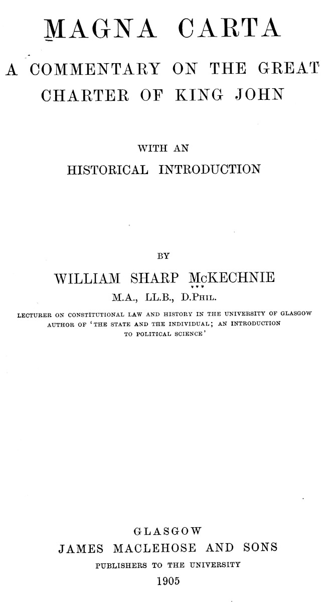 No Commentary upon Magna Carta has hitherto been written from the standpoint of modern research. No serious attempt has yet been made to supersede, or even adequately to supplement, the works of Coke and Richard Thomson, published respectively in 1642 and 1829, and now hopelessly out of date. This lack of enterprise may be due in part to a natural reluctance to undertake so laborious a task, but seems also to suggest tacit acquiescence in the opinion of Bishop Stubbs that no separate commentary is required, since “the whole of the constitutional history of England is little more than a commentary on Magna Carta.” Yet, for that very reason the Great Charter is surely worthy to be made the subject of special and detailed study, since few documents can compete with it in the variety and interest of its contents, in the vividness of its historical setting, or in the influence it has exercised on the struggle for constitutional liberty. That this conspicuous gap in our historical and legal literature should have remained so long unfilled is the more remarkable in view of the great advance, amounting almost to a revolution, which has been effected since Coke and Thomson wrote. Within the last twenty years, in especial, a wealth of new material has been explored with notable results. Discoveries have been made, profoundly affecting our views of every branch of law, every organ of government, and every aspect of social and individual life in medieval England. Nothing, however, has hitherto been done towards applying to the viiisystematic elucidation of Magna Carta the new stores of knowledge thus accumulated.