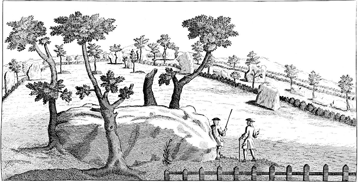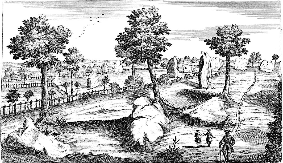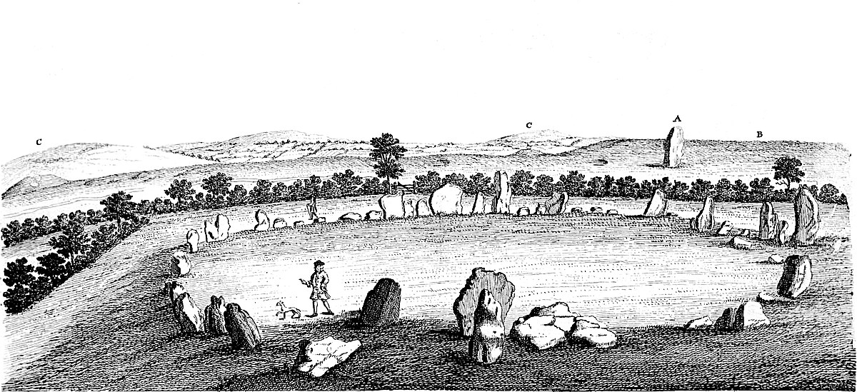 2. ’Tis an open temple of a circular form, made of stones set upright in the ground. The stones are rough and unhewn, and were (as I apprehend) taken from the surface of the ground. I saw stones lying in the field north of Norton, not far off, of good bulk, and the same kind as those of our antiquity. There are such in other places hereabouts, whence the Druids took them: tho’ in the main, carry’d off ever since, for building and other uses.