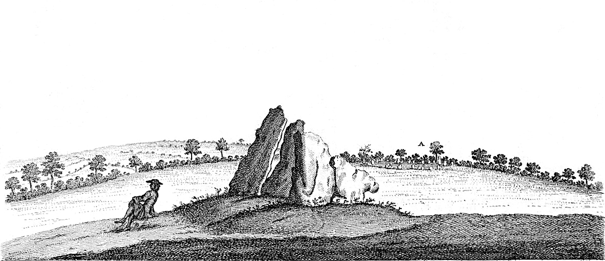 Return we nearer to the temple, and we see 300 paces directly east from it in the same field, a remarkable monument much taken notice of; ’tis what the old Britons call a Kist vaen or stone chest; I mean the Welsh, the descendants of those invaders from the continent, Belgæ, Gauls and Cimbrians, who drove away the aboriginal inhabitants, that made the works we are treating of, still northward. Hence they gave them these names from appearances; as Rowldrich, the wheel or circle of the Druids; as Stonehenge they call’d choir gaur, the giants’ dance; as our saxon ancestors call’d it Stonehenge, the hanging-stones, or stone-gallows. Every succession of inhabitants being still further remov’d from a true notion and knowledge of the things.