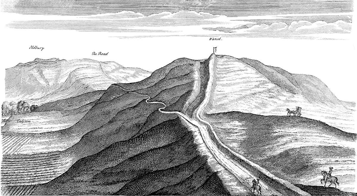 In the same plate may be seen another barrow, but circular, below the road to the left hand, on the side of the hill. Under it is a spring-head running eastward to Long Compton. This barrow has had stone-work at the east end of it. Upon this same heath eastward, in the way to Banbury, are many barrows of different shapes, within sight of Rowldrich; particularly, near a place call’d Chapel on the heath, is a large, flat, and circular tumulus, ditch’d about, with a small tump in the center: this is what I call a Druid’s barrow; many such near Stonehenge, some whereof I opened; a small circular barrow a little way off it. There are on this heath too, many circular dish-like cavities, as near Stonehenge, we may call them barrows inverted.