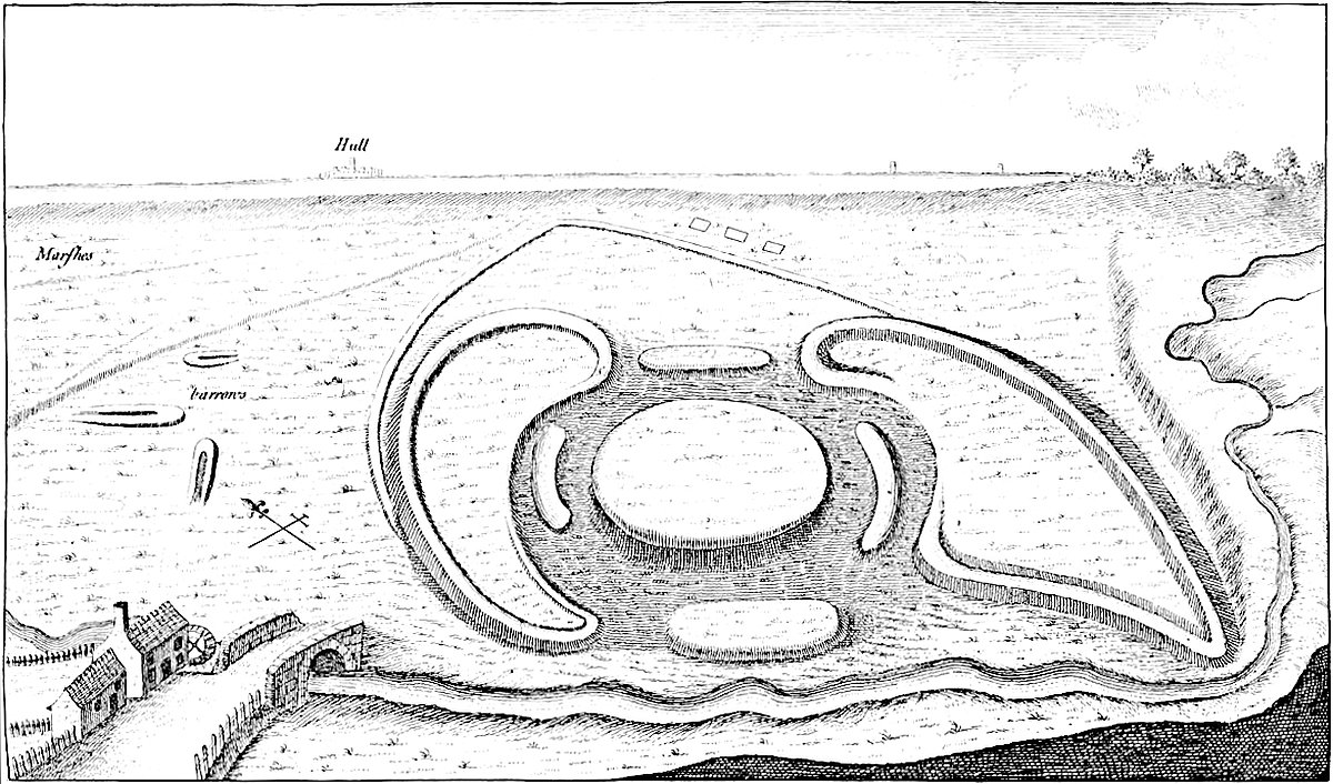 Not far from the Druid’s barrow I saw a square work, such as I call Druids’ courts or houses. Such near Stonehenge and Abury. ’Tis a place 100 cubits square, double-ditch’d. The earth of the ditches is thrown inward between the ditches, so as to a raise a terrace, going quite round. The ditches are too inconsiderable to be made for defence. Within are seemingly remains of stone walls. ’Tis within sight of the temple, and has a fine prospect all around, being seated on the highest part of the ridge. A little further is a small round barrow, with stone-work at the east end, like that before spoken of near Rowldrich; a dry stone wall or fence running quite over it, across the heath.