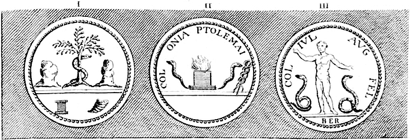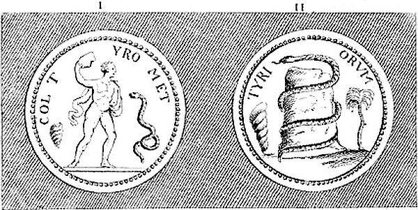 These temples of ours are always of a round form: and there are innumerable of them, all over the Britannic isles, nevertheless they are to be ranked into three kinds; for tho’ they are all circular, yet there are three manifest diversities which I have observ’d, regarding that threefold figure, by which the ancients, probably even from Adam’s time, express’d in writing, the great idea of the deity. This figure by Kircher is call’d ophio-cyclo-pterygo-morphus. ’Tis a circle with wings, and a snake proceeding from it. A figure excellently well design’d to picture out the intelligence they had, no doubt, by divine communication, of the mysterious nature of the deity. And it was the way of the ancients in their religious buildings, to copy out or analogize the form of the divine being, as they conceiv’d it, in a symbolical manner. By this means they produc’d a most effectual prophylact, as they thought, which could not fail of drawing down the blessings of divine providence upon that place and country, as it were, by sympathy and similitude.