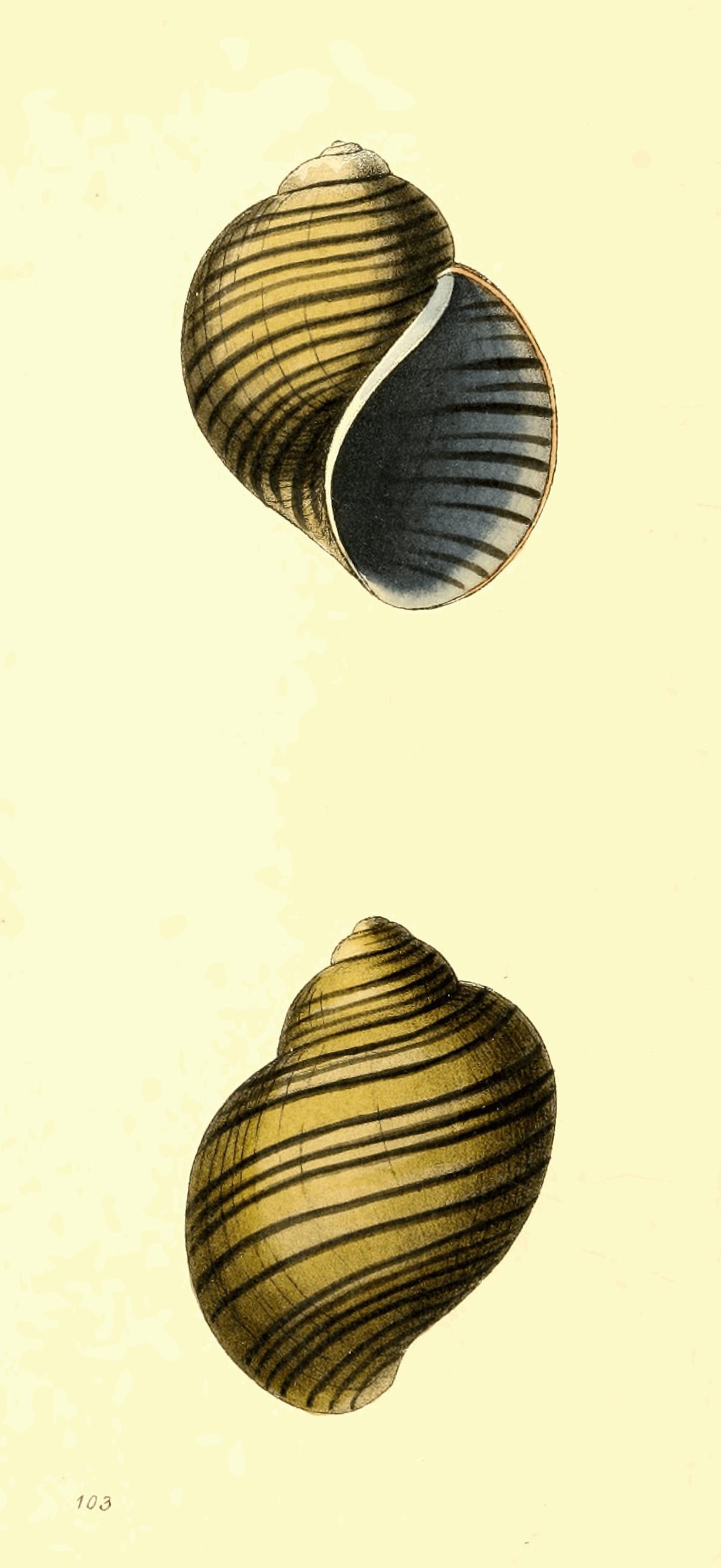 Basal whirl nodulous; spire short, nearly smooth, with a sulcated line parallel with the suture; outer lip above gibbous, the margin straight; inner lip thick, both striated; aperture flesh colour; base truncated.