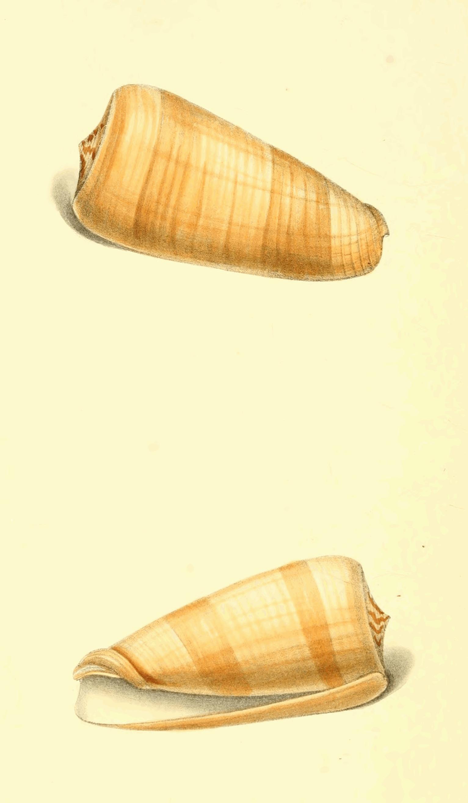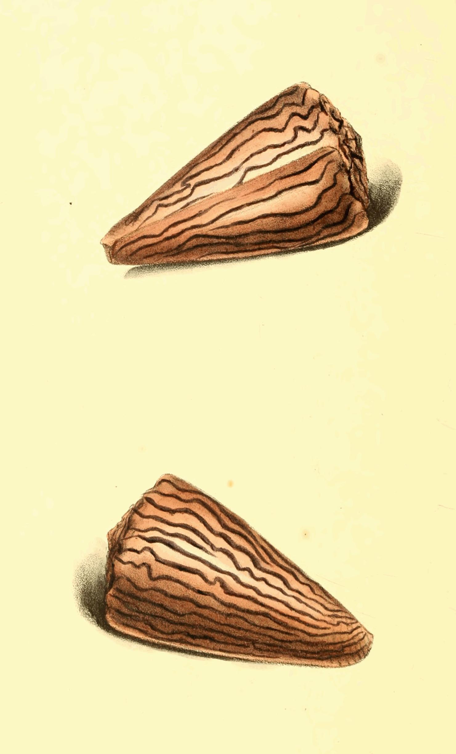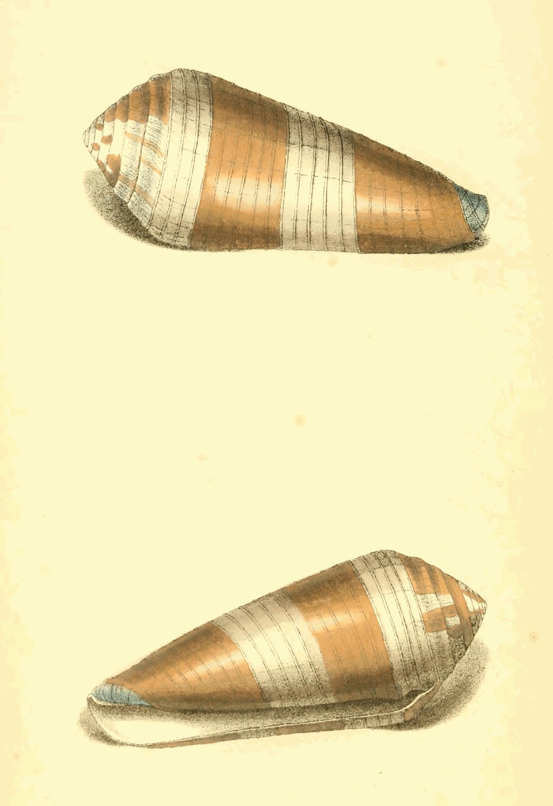 Though this is not an uncommon Shell, it is rarely seen so large as that now represented from the cabinet of Mrs. Bolton of Storrs. Of this extensive genus Lamarck has written a valuable account in the Annals of the French Museum, where he has rightly pointed out the mistake of Gmelin in placing as varieties of this species, one or two other very distinct shells: the colour of the bands is not always certain, for I have seen specimens in which they were of a dark brown; but the very thick spire, and slender form of the body whirl, with the distant, regular, and greatly elevated striæ, render it a species not easily mistaken, though in general form it comes very near to C. nussatella, and two or three others; the spiral volutions are deeply concave, and the tip and base tinged with violet.