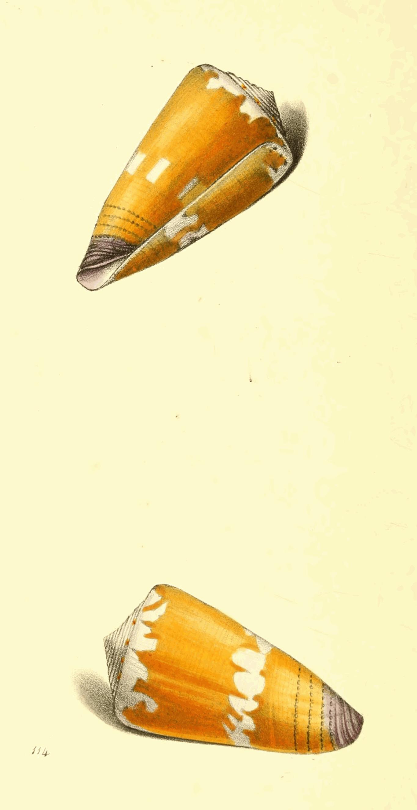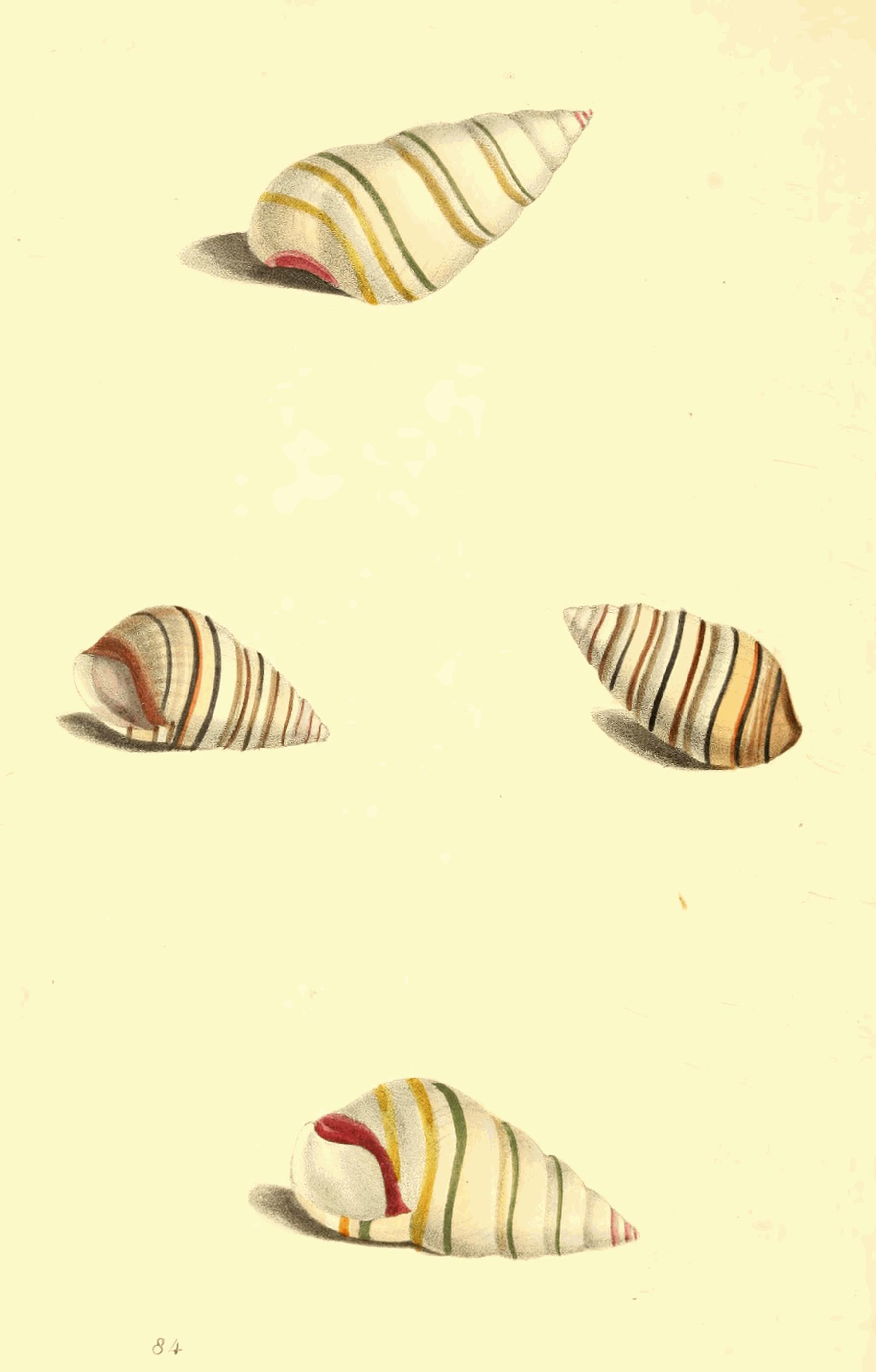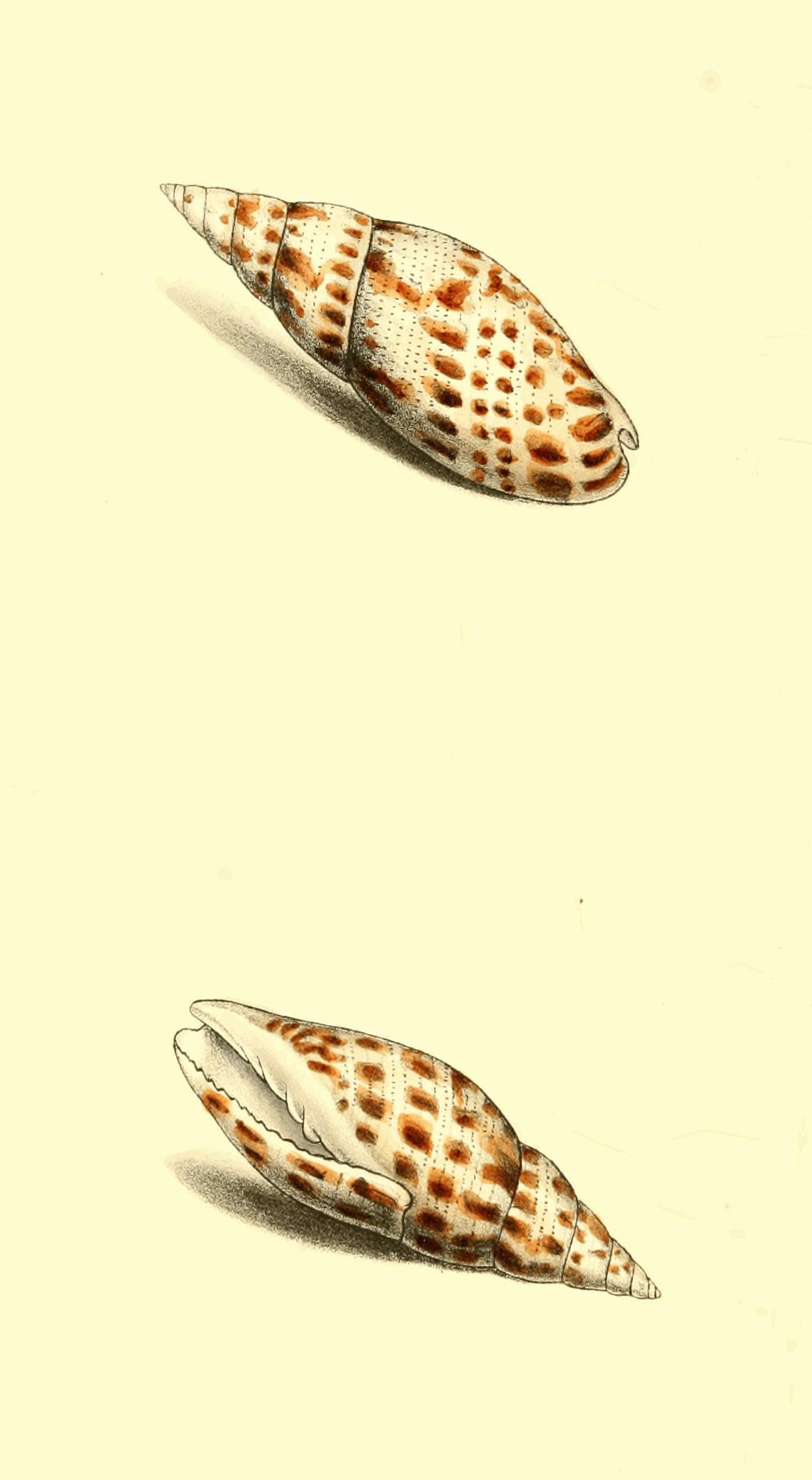 Though this is not an uncommon Shell, it is rarely seen so large as that now represented from the cabinet of Mrs. Bolton of Storrs. Of this extensive genus Lamarck has written a valuable account in the Annals of the French Museum, where he has rightly pointed out the mistake of Gmelin in placing as varieties of this species, one or two other very distinct shells: the colour of the bands is not always certain, for I have seen specimens in which they were of a dark brown; but the very thick spire, and slender form of the body whirl, with the distant, regular, and greatly elevated striæ, render it a species not easily mistaken, though in general form it comes very near to C. nussatella, and two or three others; the spiral volutions are deeply concave, and the tip and base tinged with violet.