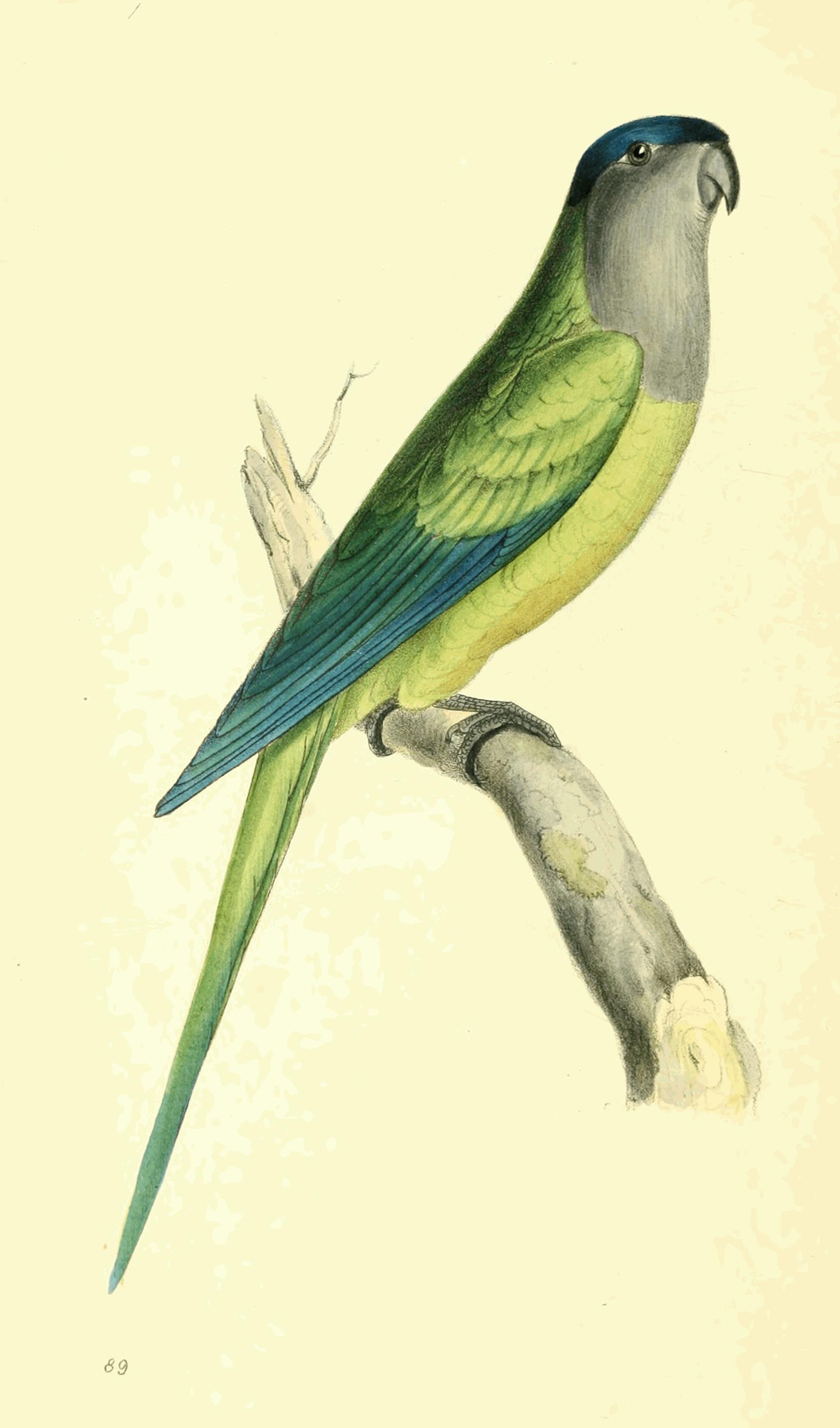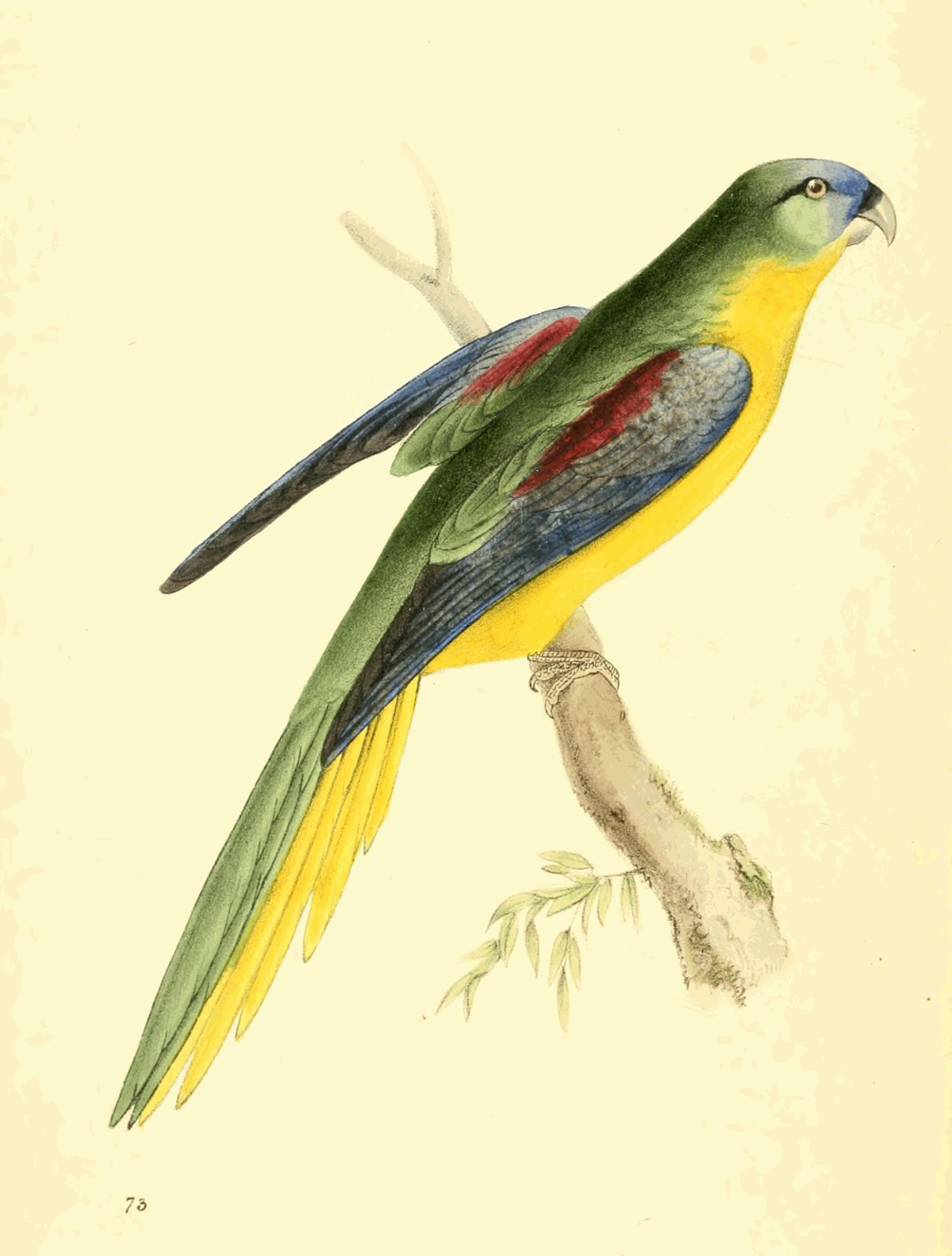 Long-tailed Parrakeet, green above; yellow beneath; forepart of the head, cheeks, and wing covers light blue; quills deep blue; lateral tail feathers yellow.