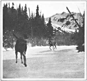 No; the moose does not prefer to live in thick timber; although in Maine and northern Minnesota the timber of the moose is quite thick enough for all practical purposes. The ideal home of the moose is burned-over tracts of timber, wherein the brush grows rankly, the obstructing trees are absent, and in running or traveling the moose has only to stride over fallen trunks lying four feet high, and always about. The moose is the only land animal now living on this continent that is physically qualified, with a standing of 100 per cent, to travel fast over “down timber” and get away with it.