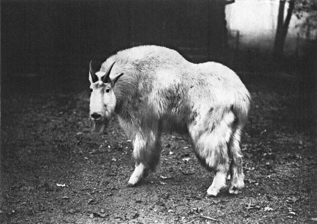 The mountain goat looks a bit like a snow-white pigmy buffalo with small black horns, and long, shaggy hair. It carries its head low, and its stick-like legs give it a stilted and awkward gait. Its shoulders, neck and hindquarters are covered with long, coarse hair, and when the animal is seen on a mountain-top the first thought is: “How very white it is!” I have compared a clean goatskin with a snowbank, and the latter had only one small point the advantage. The goat’s hair shows just a very faint tinge of pale yellow.