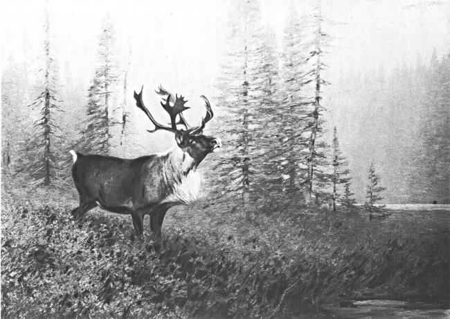 Europe and Asia have the reindeer, but North America has a truly grand array of caribou species. In size and geography they range all the way from the absurd little Peary caribou of Ellesmere Land, which looks like a goat with deer antlers upon it, to the giant of the Cassiar Mountains, known as Osborn’s caribou. Roughly speaking, our North American species are divided by their antlers into two groups, the Woodland and the Barren Ground. The important species of the latter are the Greenland caribou, the Peary, the Barren Ground, the Grant and Kenai. Of the Woodland group the leading species are the Newfoundland, Canadian, Black-Faced, and Osborn’s. The gravure shown herewith is a very fine presentation of the Canadian Woodland species from an oil painting by Carl Rungius, now owned by the Duquesne Club, Pittsburgh.