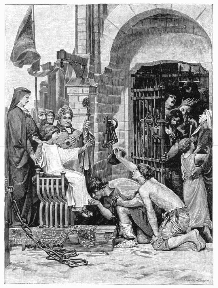Saint-Louis was but a boy of eleven when he succeeded to the throne on the death of his father, and a coalition of the great nobles was immediately formed to take advantage of his minority; but the wisdom, prudence, and piety of his mother, Blanche of Castile, not only preserved the crown for him until he came of age, but also stood him in great service during the years of his reign, especially in those in which he was absent from the kingdom on his ill-starred crusades. One of her most beneficent deeds has been immortalized by the modern painter, Luc-Olivier-Merson, in a noble mural painting,—the delivery of the prisoners held in bondage by the chapitre de Paris (Notre-Dame), several inhabitants of Châtenay who had incurred the displeasure of the ecclesiastical authorities, and who were so maltreated in their dungeons that the lives of several of them were despaired of. The queen at first sent a civil request to the chapter to release the captives under bonds, but the churchmen returned an uncivil refusal and redoubled their severities; whereupon she proceeded in person to the prison with her son, struck the doors with her bâton, her guards immediately broke them down, and the liberated serfs, men, women, and children, flocked out tumultuously to thank their deliverers on their knees. The canons protested furiously, but the discreet regent, knowing their sensitive point, allowed them to rage openly and contented herself with seizing their temporal revenues. This immediately brought them to terms; in the smoothest of phrases they besought an accommodation, and speedily agreed to set at liberty, in consideration of a certain sum, all those whom they had unjustly incarcerated.