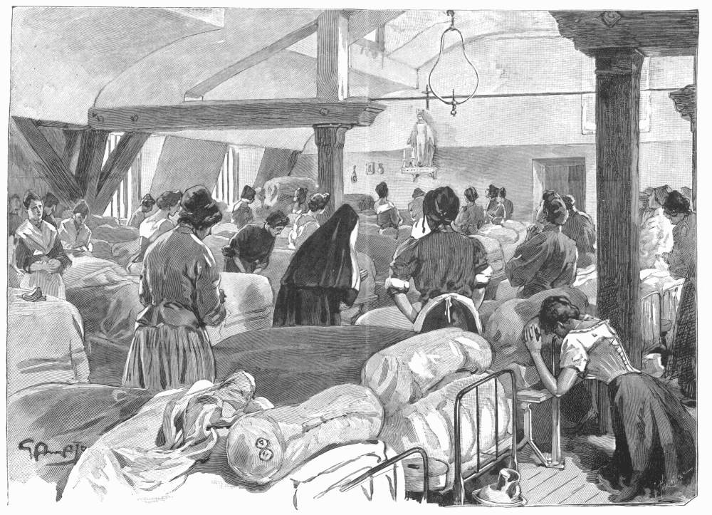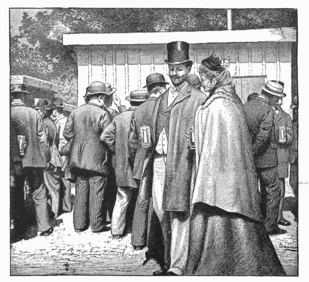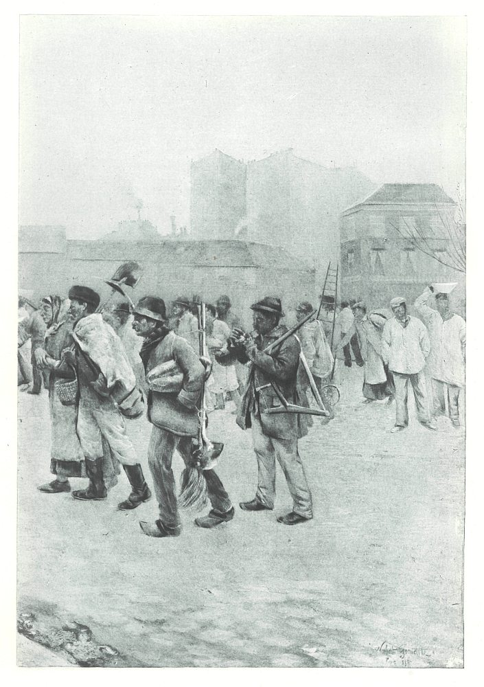 The problem of supplying Paris with good drinking water is not yet completely solved, though immense progress has been made within the last sixty years. The cholera epidemic of 1832 did much to arouse the municipal authorities to the necessity of radical reform both in the water-supply and in the system of sewage. At this date, the city was furnished by the pumps in the Seine, by the selenitic water drawn from Belleville, from the Pré-Saint-Gervais and from Arcueil, and from the canal de l'Ourcq,—inferior in quality and insufficient in quantity. The public fountains had long been the great resource of the inhabitants, and these were frequently architectural constructions worthy of their importance,—the Fontaine des Innocents, that of the Birague—now disappeared, that of the Arbre-Sec, of Gaillon and of Grenelle. The porteurs d'eau were robust young fellows, mostly from Auvergne, who carried about the Seine water in two metal buckets by means of a neck yoke, and delivered it in the loftiest houses. At night, the water-casks, always filled, were stationed at various points, so as to be available in case of fire;—the first water-carrier who reached the scene of conflagration received a reward of twelve francs. The eau de Seine, filtered, was retailed at ten centimes the voie, or two pailfuls, of ten or fifteen litres, twenty times the price it is to-day; the poor preferred to use the water just as it came from the river, polluted as it was by the sewage.