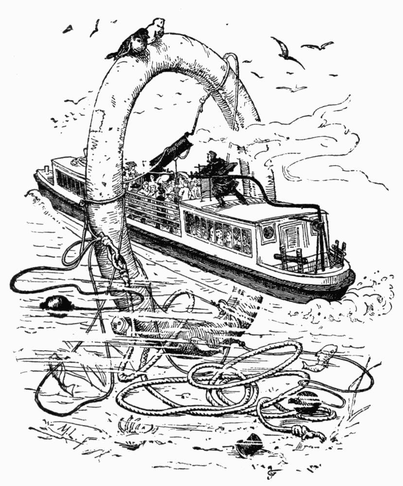 The great collecteur d'Asnières, a sectional view of which under the Rue Royale, is shown on page 299, is five mètres, sixty centimètres, in width, and three mètres, forty, in height; the channel for the water in the centre is three mètres, fifty, in width, and one mètre, thirty-five, in depth. On each side is a banquette, or sidewalk, ninety centimètres wide. The collecteurs, as well as the smaller sewers of the streets and houses, are constructed of masonry laid in mortar, and they are lined with cement which insures their cleanliness and their sonorousness. The former quality is maintained by an incessant surveillance, an organized force of nine hundred and thirty-one men being constantly employed, and an arrangement of fans or wings, mounted either upon the fronts of the boats or attached to the bottoms of the little trucks which run on rails along the edges of the canal of the larger sewers. These fans descend into the canal and sweep all obstructions before them,—the sand from the street pavements overhead constituting a large portion of this obstructive material. The siphons are cleansed by an ingenious process invented by Belgrand and applied by him to that of the Alma,—a large wooden ball, eighty-five centimètres in diameter, traversing twice a week each of the two conduits, a mètre in diameter. So thorough is this policing of the sewers, that it is recorded that the number of heavy leathern thigh boots furnished the égoutiers is some twelve hundred or two thousand annually, representing a value of nearly a hundred thousand francs. One pair of these boots lasts about six months.