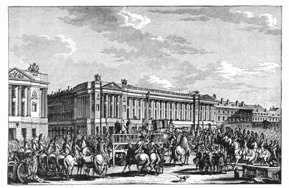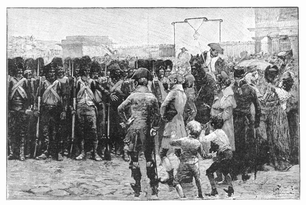 "The magistrate severely reprimanded Gabriel Sanson.... During this interval, the valets went into the shops of the grocers of the neighborhood to provide themselves with what was necessary; but when they issued from the enclosure, the crowd followed them,—in all the shops which they entered their purpose was made known and the merchants refused to sell them, or pretended not to have what they desired; it was necessary for the lieutenant to send with them an officer to demand, in the king's name, the objects of which they had need."