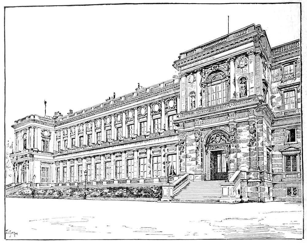 Some interesting details have recently appeared concerning the official residence, the Tuileries, under the last of the French Empires. For the commonplace furniture which they found there, the Emperor and the Empress gradually substituted other, much more luxurious. His apartments were on the ground-floor, communicating by a small stairway with those of the Empress on the floor above. There, the first salon, in pale green and gold, reserved for the chamberlains and the ladies of honor, was furnished with a great mirror in which were reflected all the gardens, the Champs Ãlysées and the Arch of Triumph in the distance; this room gave access to the pink salon, of which the chimney-piece was in white marble, set off with lapis-lazuli and gold, and the ceiling represented the Arts rendering homage to her Majesty. From this salon the visitor entered the blue one, where she gave private audience, "always receiving her guests graciously and manifesting an unwillingness to part with them." Beyond the salon bleu was a little cabinet with a secretary, a little boudoir, the library with small ebony tables, the dressing-room, the oratory, entered through folding-doors, and finally the bedchamber of the Empress.