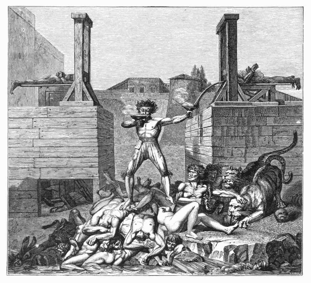 "The four horses sprang violently forward, one of them fell, but the body of the unfortunate wretch was not dismembered.