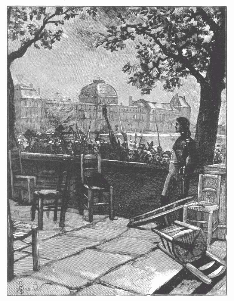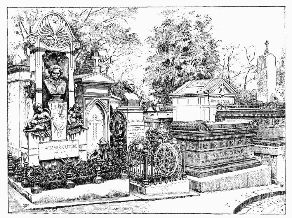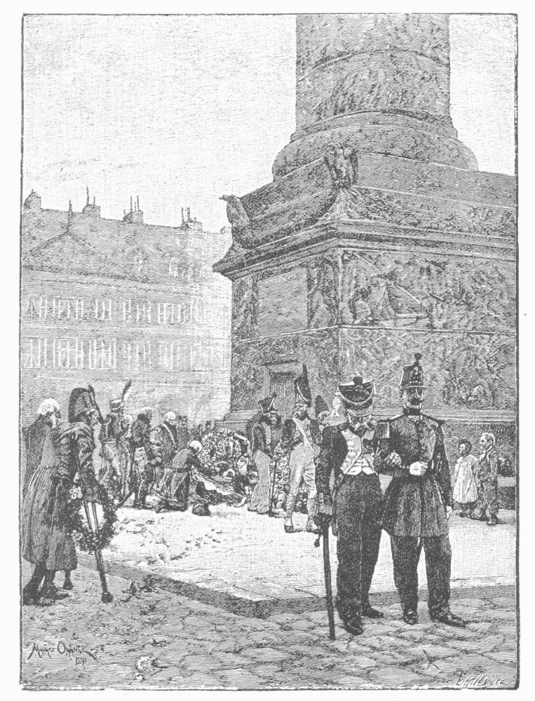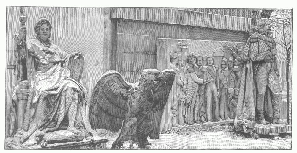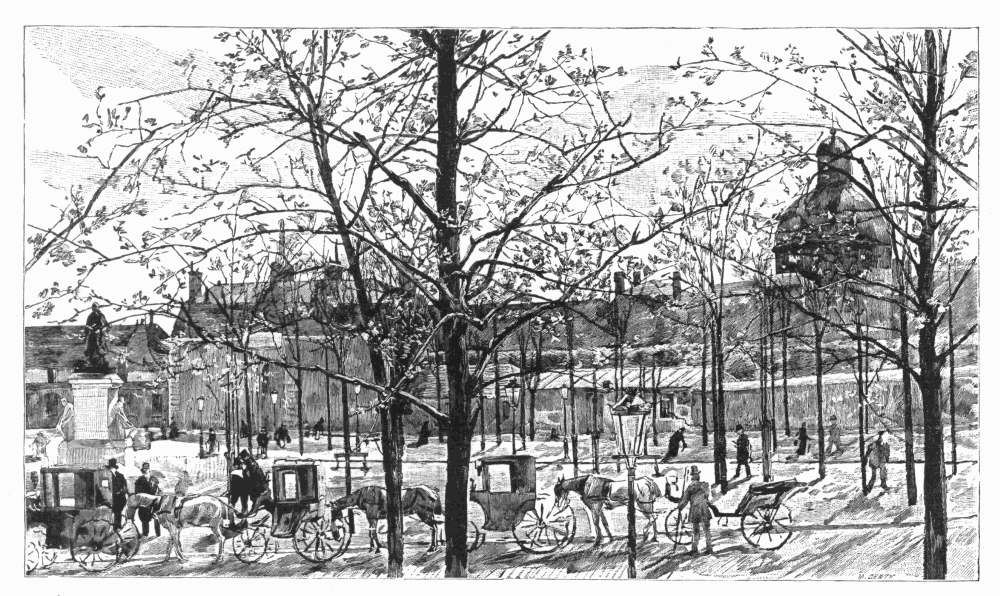 Another of these minor municipal details—and possibly a more affecting one—is the official Dépôt des Marbres, established adjoining the official museum of the Garde-Meuble at the end of the Rue de l'Université, by the side of the Champ de Mars. Here are deposited irreverently and in various stages of dilapidation all the official statues, royal, imperial, and republican, that have out-lived their day. "The marble of the statues of the State," said a cynical sculptor, "has the peculiarity of cracking after only a very short period of use." Some of these official marbles have had a longer period than others; but they all end here. Our illustration shows a corner of this depository,—at the angle, Napoleon III, sculptured by Iselin; behind him, a relief representing the return of the ashes of his great uncle; in the foreground, the Imperial eagle, with his fiery glance forever dimmed, and, at the left, a seated figure of Louis XVIII. Kings, potentates, and powers, official allegories, emblems, and symbols, are all set down here together, at the mercy of the weather. In the adjoining grand central pavilion are accumulated the official portraits of these departed rulers, including very many of the late Emperor and Empress,—"all the old rattles of France, all the playthings that she has broken."