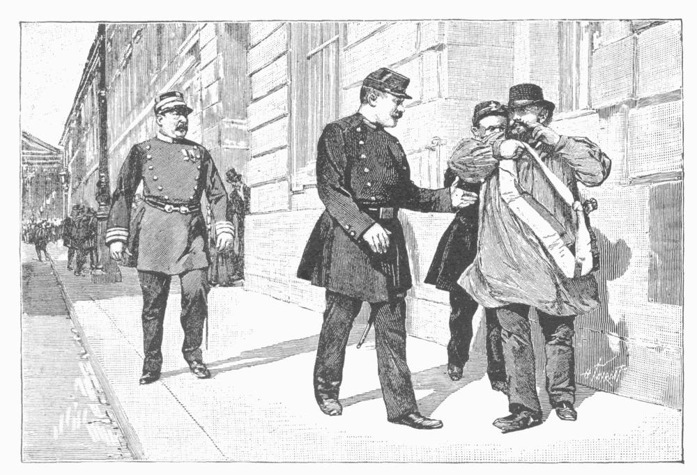 The administration of the Préfecture de Police is divided into three Bureaux, the first of which is closely connected with the cabinet of the Préfet, and the two others constitute the first and the second divisions. The first Bureau is divided into four sections, and the second into two, each of these subdivisions having its special department. The Commissaires de Police are municipal officers appointed in Paris by a decree of the President of the Republic on the nomination of the Minister of the Interior, in the proportion of one for every ten thousand inhabitants. In cities and towns having a population of less than six thousand, these officers are appointed by the Préfet. They are charged with the duty of enforcing the laws and the regulations of the municipal police, the pursuit and arrest of criminals, and they have authority in all controversies and litigations brought before the Tribunals Civils, or those which never appear in court. The immediate chief of the police, or gardiens de la paix, of each arrondissement, is the Officier de Paix, who has his headquarters in the Mairie of that arrondissement, and who is the functionary to appeal to in all matters connected with the public highways. "(1) If you have cause to fear any scandal, if you have need of police protection, he will give orders to have a gardien posted at your door; (2) if you have any cause of complaint against individuals, cab-drivers, cartmen, street-vendors, who crowd the street, or who make a disturbance before your dwelling, he will draw up against them procès-verbaux de contravention [which is a very efficient remedy]; (3) he is obliged to assure, by the gardiens de la paix, the safety of children who have to cross wide streets when leaving school; (4) at night, it is he who sends to the hospitals the persons who may be found sick or wounded in the streets; (5) it is to him that notice must be given of the disappearance of old persons, children, sick, or those demented; he immediately notifies the municipal police headquarters, which, in turn, sends word to all the posts throughout Paris."