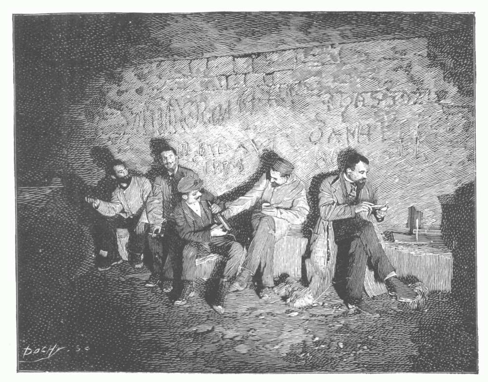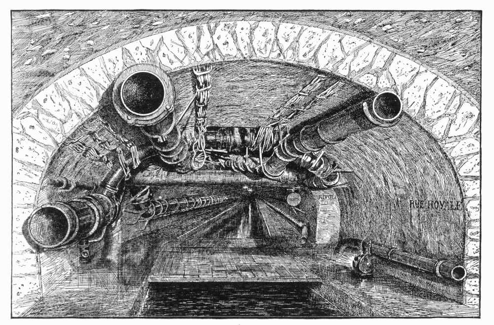 For the wagonnets de service in the larger sewers, an ingenious arrangement is used,—on the little four-wheeled truck which runs on rails along the edge of the central canal are laid two more sections of railroad at right angles, and on these are mounted two more four-wheeled trucks carrying each a rectangular little tank or receptacle, with a rounded bottom. The outside rail, at each end, is blocked, so as to keep these tanks in position while in transit,—when arrived at their destination, the blocks are removed and the two run off on other rails to be emptied. The Parisian sewers carry not only the drainage of the streets and houses, but also all those various underground means of communication which in other, and less well-ordered, municipalities have each their own burrowing to do,—at the cost of infinite expense and confusion. The water-pipes, the telegraphic cables, the telephone wires, the pneumatic tubes for the postal service, and the piping for the conveyance of motive power, are all sheltered in these underground thoroughfares. So complete and well organized, indeed, are these égouts, that that constant habitant of sewers, the rat, is being driven out of them,—neither the black rat nor his enemy, the great Norway animal, can find lodging and refuge in these cement-lined walls, as hard as steel. The task of the hunter of rodents is greatly facilitated by all these improved methods.