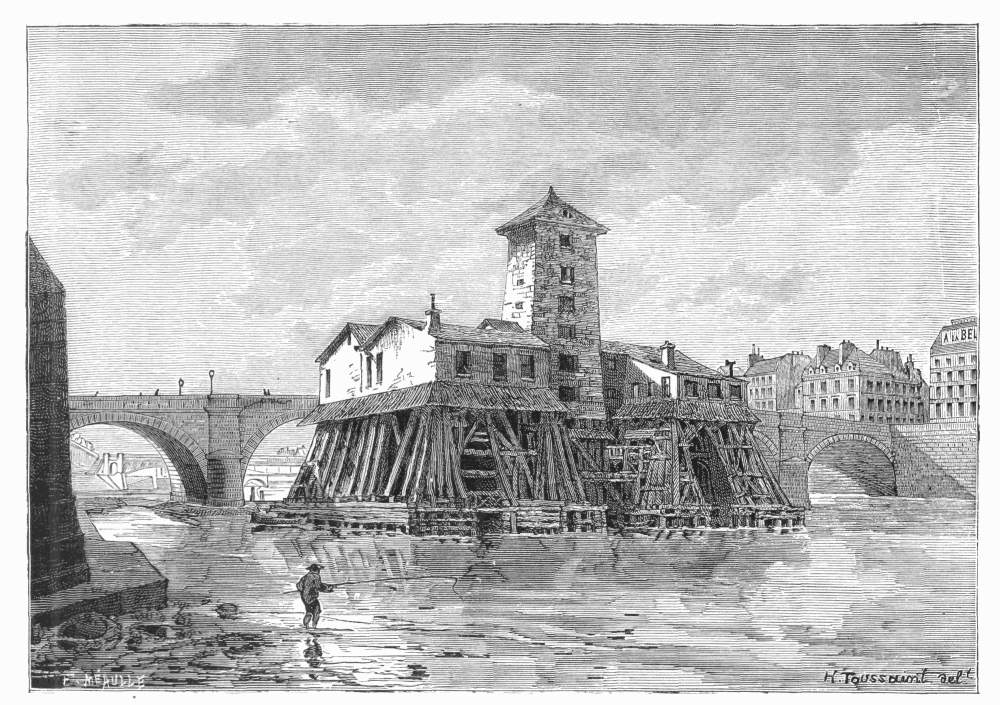 THE PUMPS OF PONT NOTRE-DAME, FROM THE QUAI DE GESVRES, AS THEY APPEARED IN 1861. THEY WERE DEMOLISHED IN 1866.