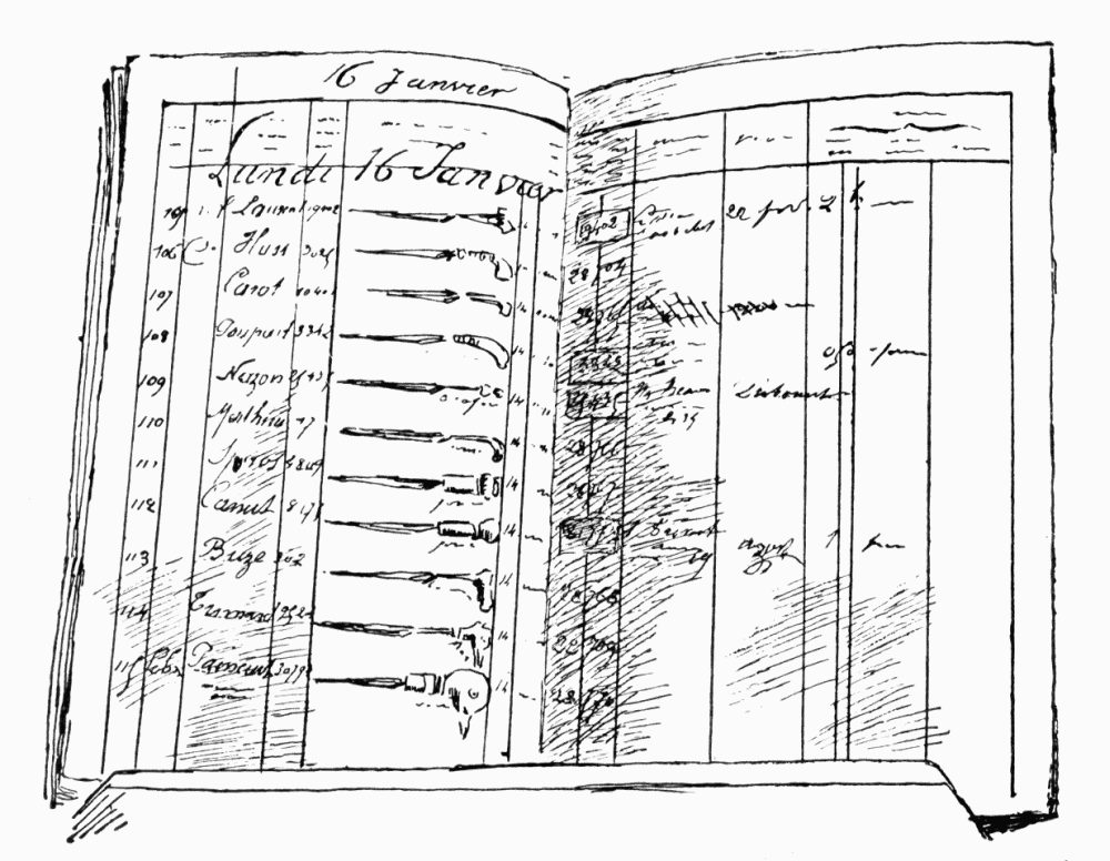 LEDGER OF THE "LOST-AND-FOUND BUREAU," AT THE PREFECTURE OF POLICE, SHOWING SKETCHES OF HANDLES OF FOUND UMBRELLAS.