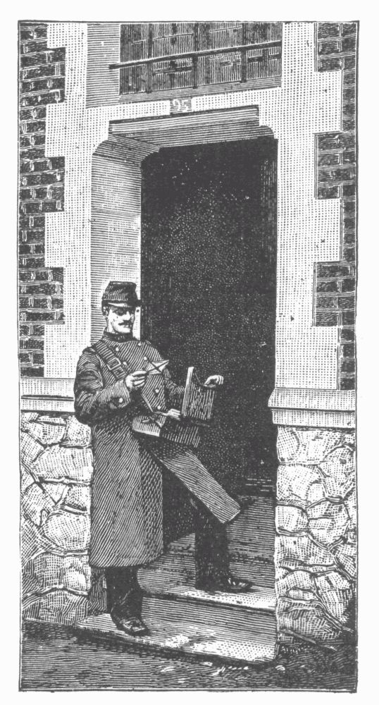 The arrangements for mailing and receiving letters in Paris are, in general, very satisfactory,—the branch post-offices are over a hundred in number, and they will receive not only letters and mailable packages, but telegrams. They do a very large business, and are generally thronged all day in the popular quarters,—the registry department being greatly in favor. At night, they are recognizable by their blue lanterns, and there are also, since 1894, auxiliary offices in certain shops designated by blue signs. The letter-boxes, set in the wall of the building, so that letters and packages may be mailed from the street, are usually four in number, one each for Paris, the departments, foreign mail, and for printed matter. Stamps may be bought and letters mailed also in very many of the small tobacco-shops, in public buildings, and in the dépôts of the railways and the tramways of the suburbs. There are eight collections and distributions a day, on work-days, and five on Sundays and fête-days; the facteur, or carrier, has discharged his duty when he has left the mail with the concierge of the building, and its final delivery rests entirely with the latter functionary. These facteurs, who are generally intelligent and conscientious, wear the inevitable uniform of all French officials, and carry their mail in an absurd stiff little leathern box, suspended in front of their stomachs by a strap around their necks. Their distributing matter never seems to exceed the capacity of this box,—ranging in quantity from a third to a tenth of the ordinary burden of a New York letter-carrier.