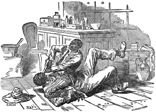 | A Southern country Doctor. Ancient mode of “pulling teeth.” Dinkie the King of the Voudoos. |