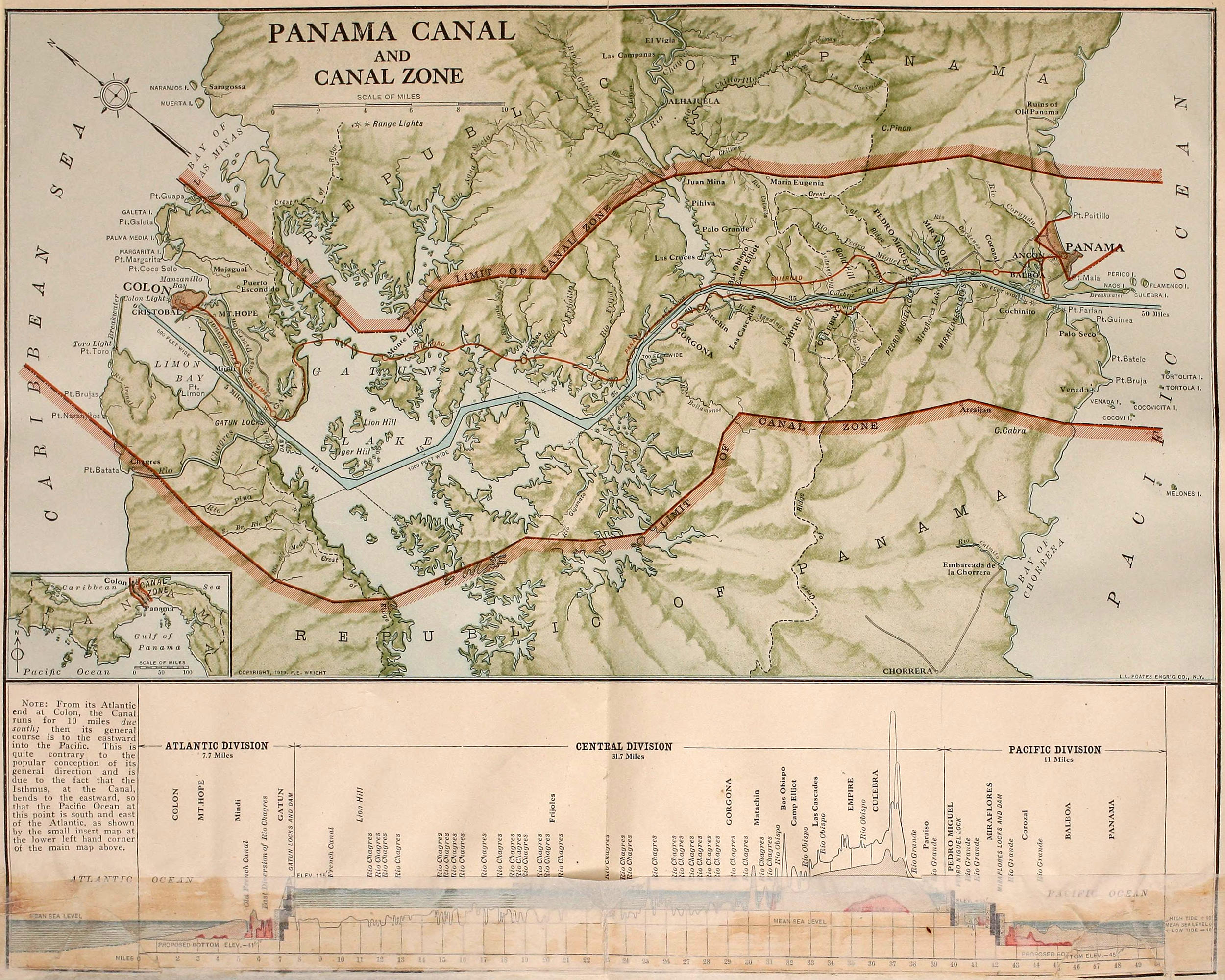 Note: From its Atlantic end at Colon, the Canal runs for 10 miles due south; then its general course is to the eastward into the Pacific. This is quite contrary to the popular conception of its general direction and is due to the fact that the Isthmus, at the Canal, bends to the eastward, so that the Pacific Ocean at this point is south and east of the Atlantic, as shown by the small insert map at lower left hand corner of the main map above.
